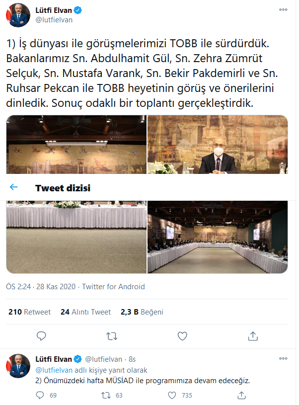 Hazine ve Maliye Bakanı Elvan, TOBB yöneticileri ile yaptığı görüşme ile ilgili görüşlerini Twitter’daki hesabından paylaştı. Bakan Elvan’ın açıklaması şöyle; İş dünyası ile görüşmelerimizi TOBB ile sürdürdük. Bakanlarımız Sn. Abdulhamit Gül, Sn. Zehra Zümrüt Selçuk, Sn. Mustafa Varank, Sn. Bekir Pakdemirli ve Sn. Ruhsar Pekcan ile TOBB heyetinin görüş ve önerilerini dinledik. Sonuç odaklı bir toplantı gerçekleştirdik. Önümüzdeki hafta MÜSİAD ile programımıza devam edeceğiz.”