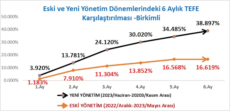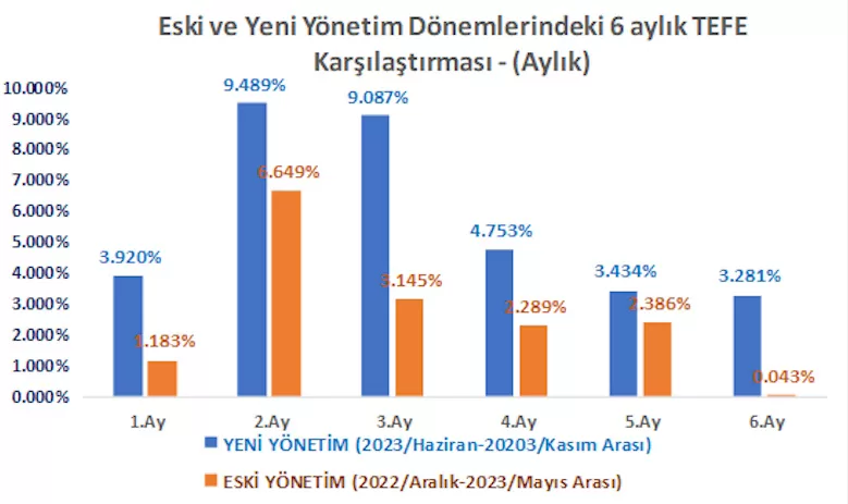 Rasyonel politikaları uygulayan yeni ekonomi yönetiminin 2023 Haziran -2023 Kasım ayı arasındaki 6 aylık dönemi ile eski ekonomi yönetimin 2022 Aralık – 2023 Mayıs ayı arasındaki son 6 aylık dönemindeki TEFE gelişmeleri kıyaslandığında, yeni yönetim aleyhine ciddi bir başarısızlık hali ortaya çıktı. Eski yönetimin son 6 aylık döneminde enflasyon %16,62 olarak gerçekleşmiş iken, yeni yönetim 6 aylık döneminde bunun iki katı oranında % 38.90 olarak gerçekleşti. Şu ana kadar oluşan performans karşılaştırılmasında ciddi bir başarısızlık hali aşikârdır.