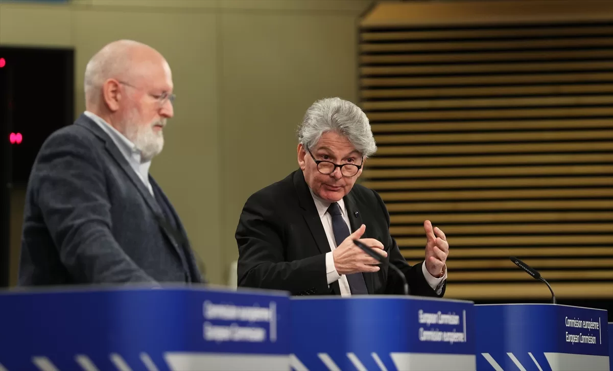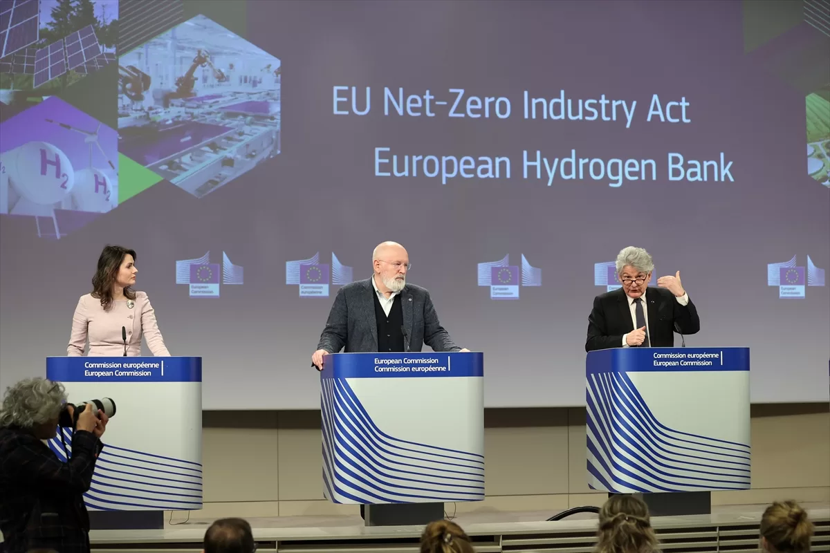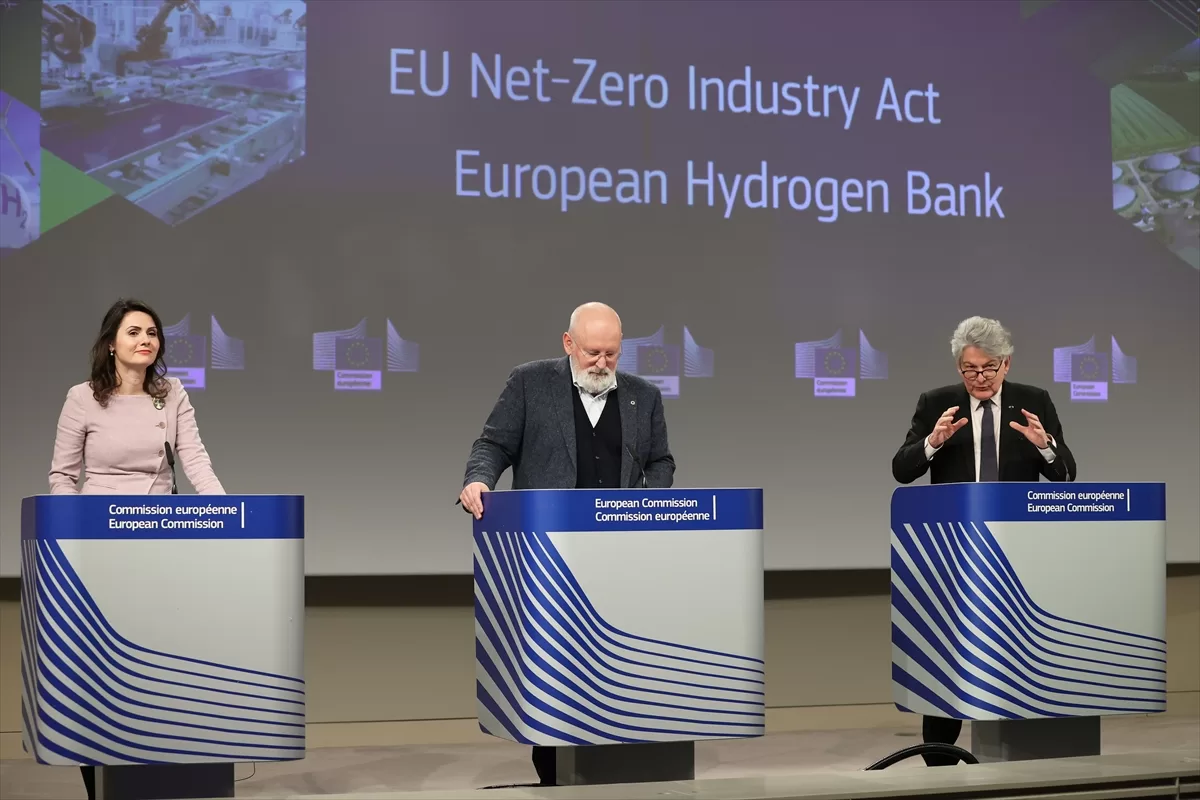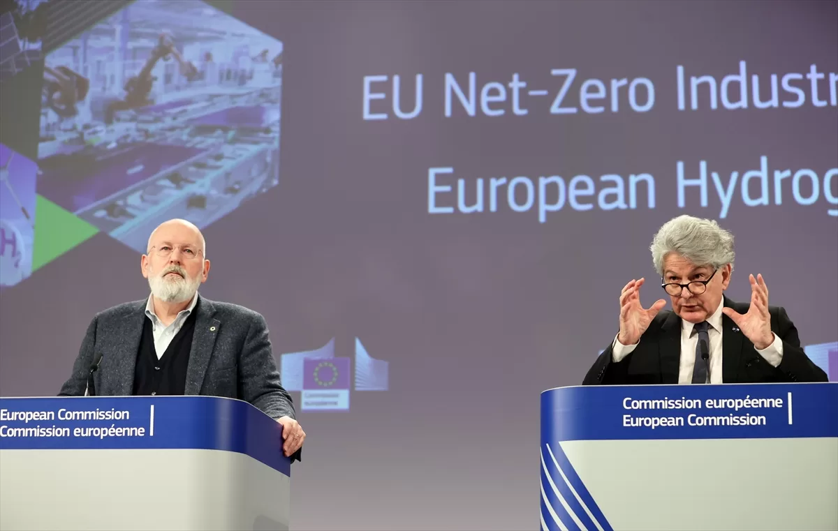 AB Komisyonu Başkan Yardımcısı Frans Timmermans ve AB Komisyonu Üyesi Thierry Breton, Brüksel'de Net Sıfır Sanayi Yasası ve Avrupa Hidrojen Bankası yol haritası hakkında basın toplantısı düzenledi.