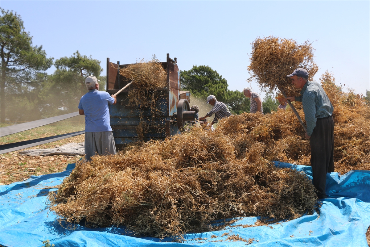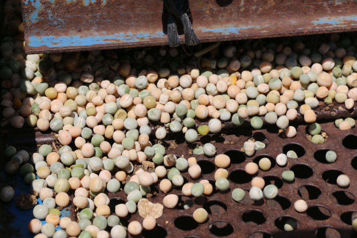 İşçiler tarafından elle topraktan çekilip 3-4 gün tarlada kurumaları sağlanan kuru bezelyelerin patozla dane ve sap kısmı ayrıştırıldı.