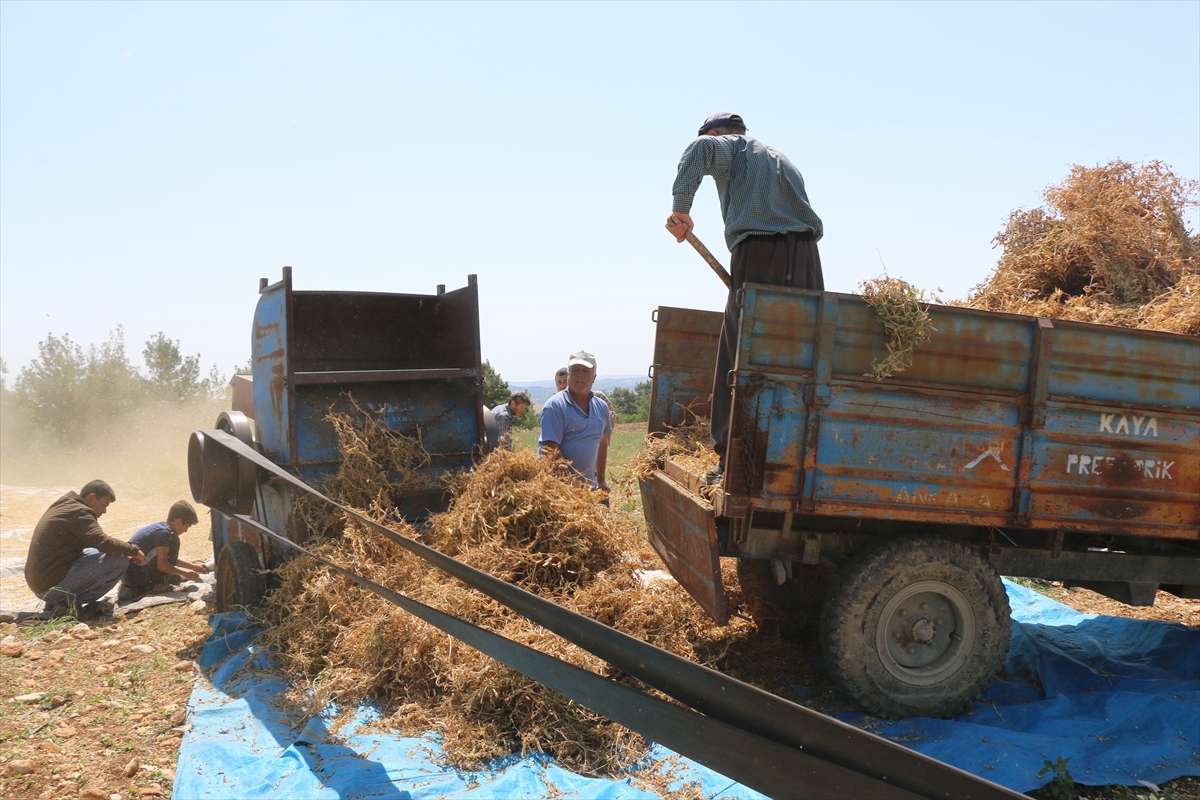 Karaisalı ilçesi Demirçit Mahallesi'nde Sedat Gök'ün yaklaşık 8 dekarlık tarlasına ekilen kuru bezelyelerin hasadı yapıldı.