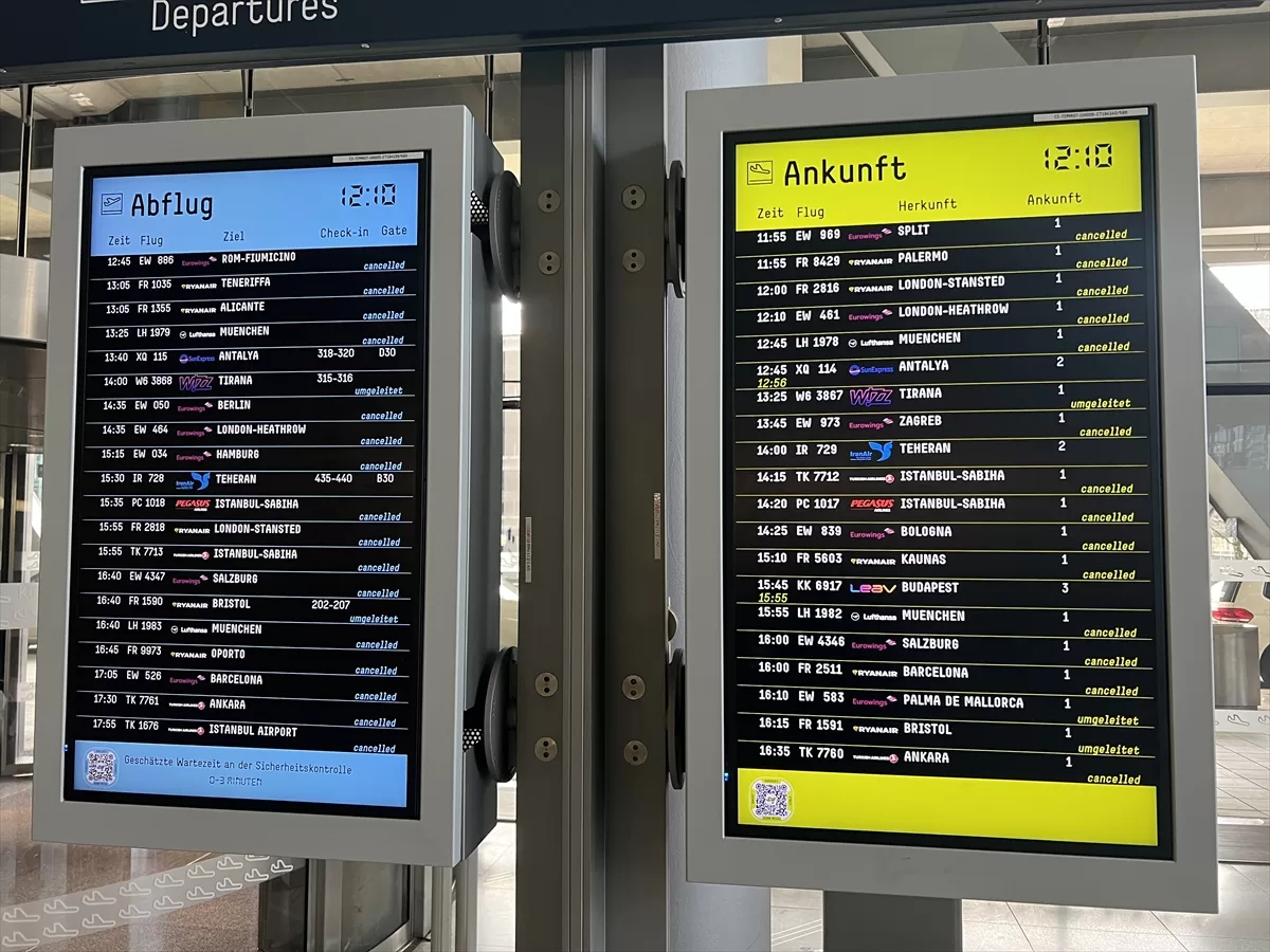 Düsseldorf Havalimanı'nda planlanan 391 kalkış ve inişten 264'ünün, Köln Bonn Havalimanı'nda da 100 uçuşun iptal edildiği bilgisi paylaşıldı.