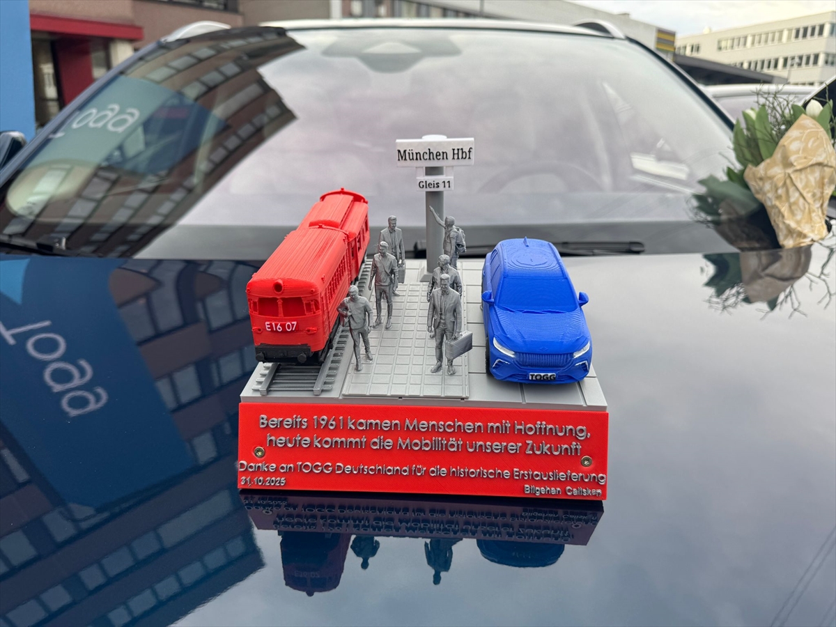 Aracını teslim alan makine mühendisi Bilgehan Çalışkan da üzerinde Münih Tren Garı’na gelen Türklerin ve Togg otomobilin bulunduğu ve “1961’de insanlar umutla geldiler, bugün geleceğimizin mobilitesi geliyor. Tarihi ilk teslimat için TOGG Almanya’ya teşekkürler.” yazılı maketi TOGG yetkililerine hediye etti.