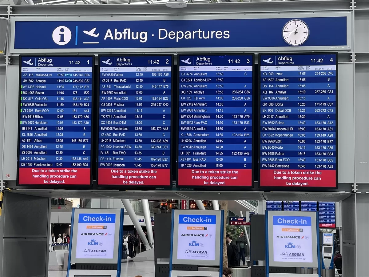 BERLİN (AA) – Almanya'nın dört havalimanındaki güvenlik personelinin 48 saatlik uyarı grevi, uçak seferlerinin büyük bölümünü durma noktasına getirirken, uçuşların iptal edilmesinden yaklaşık 100 binden fazla yolcunun etkilenmesi bekleniyor.