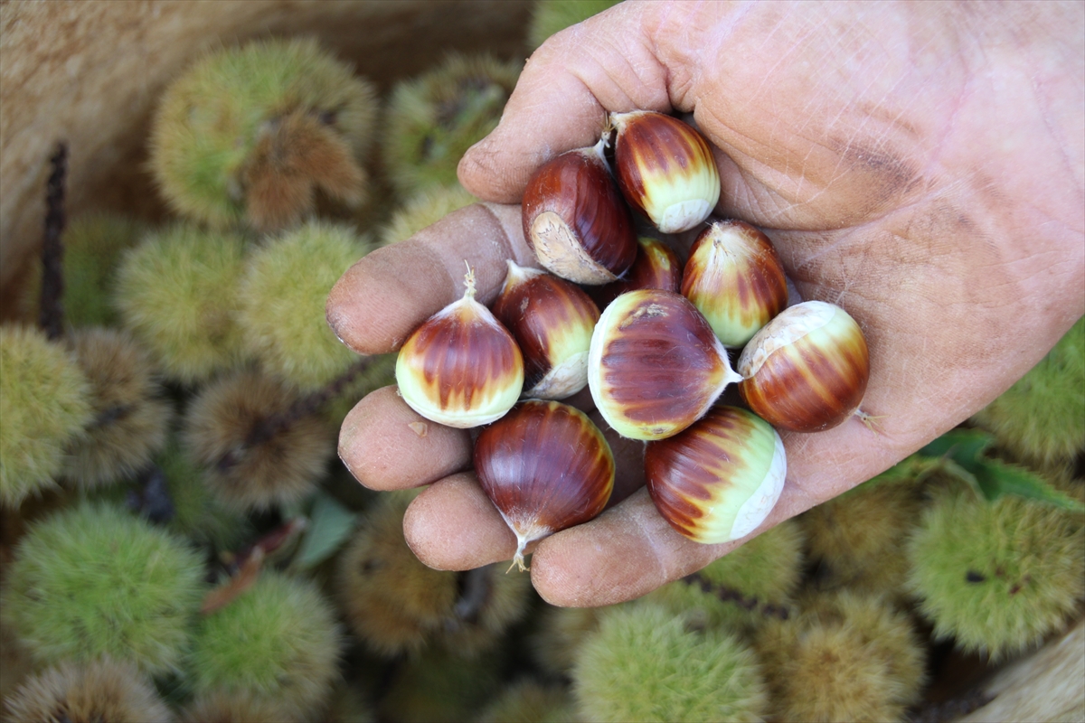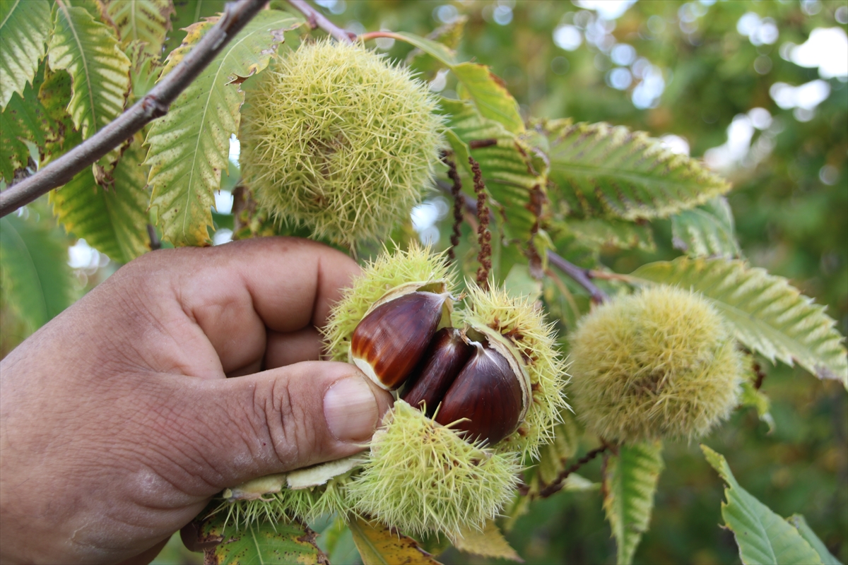Çiftçi Nihat Teke'nin 8 yıl önce arkadaşının tavsiyesi üzerine 1330 rakımlı Sarıkaya Mahallesi'nde diktiği ve ilk kez geçen sene 6 ton ürün topladığı kestanede bu yıl verim arttı.