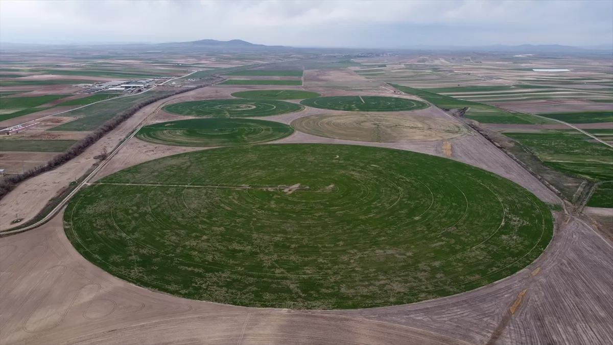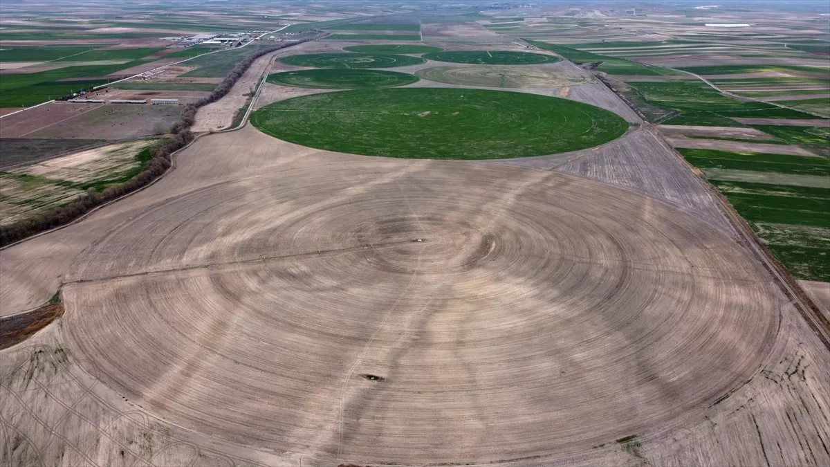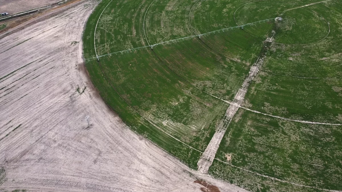 Modern ekipmanlar ve teknolojinin kullanıldığı işletmede "center pivot" sistemiyle sulanan dairesel tarım arazileri dronla görüntülendi.