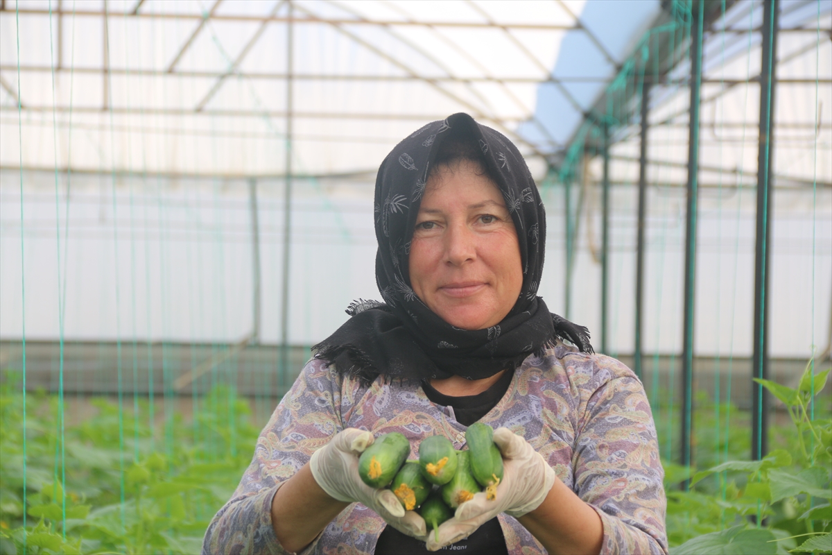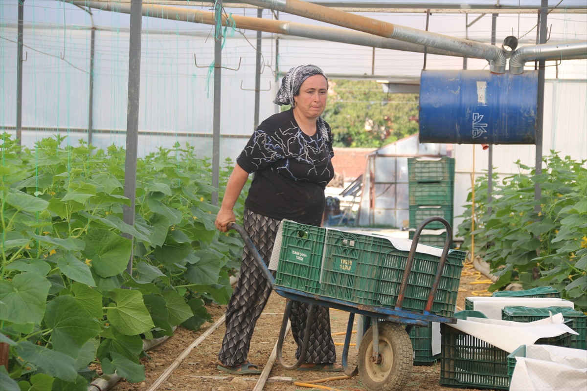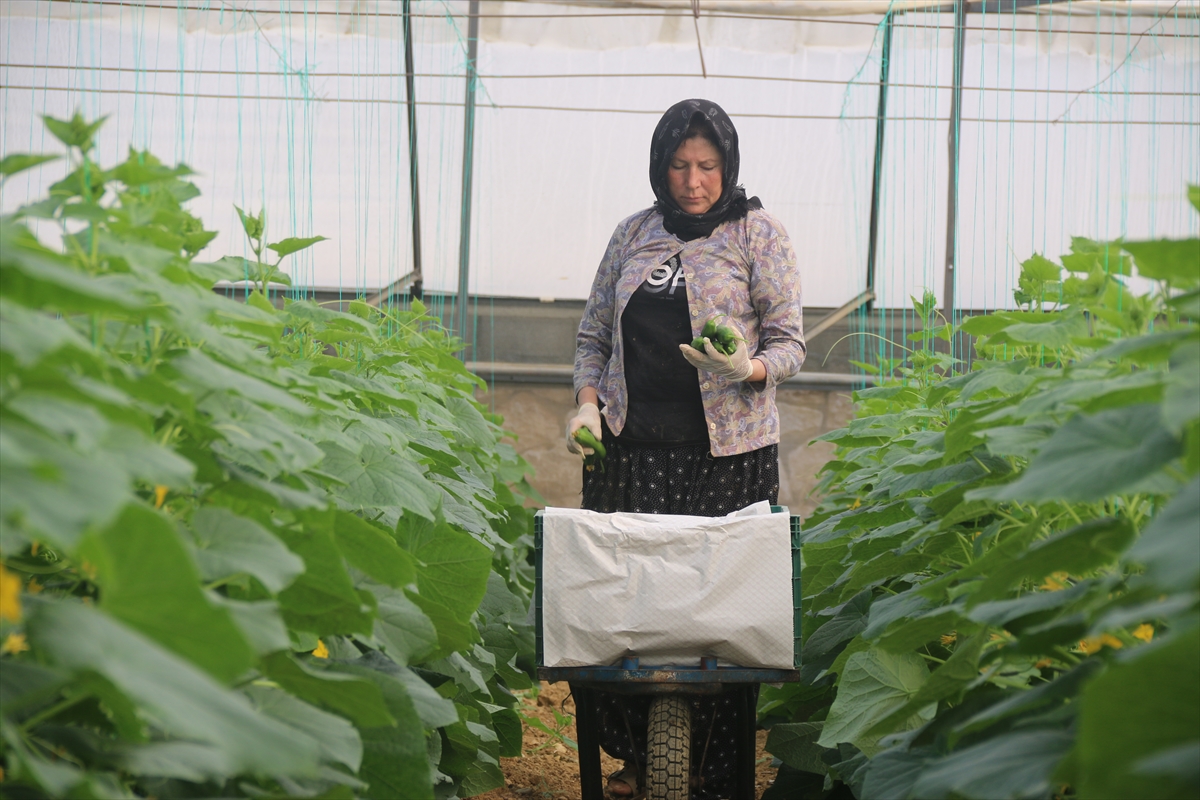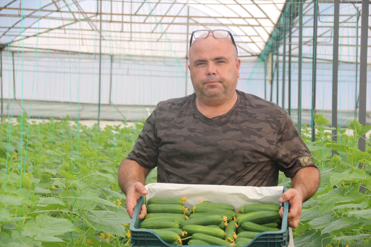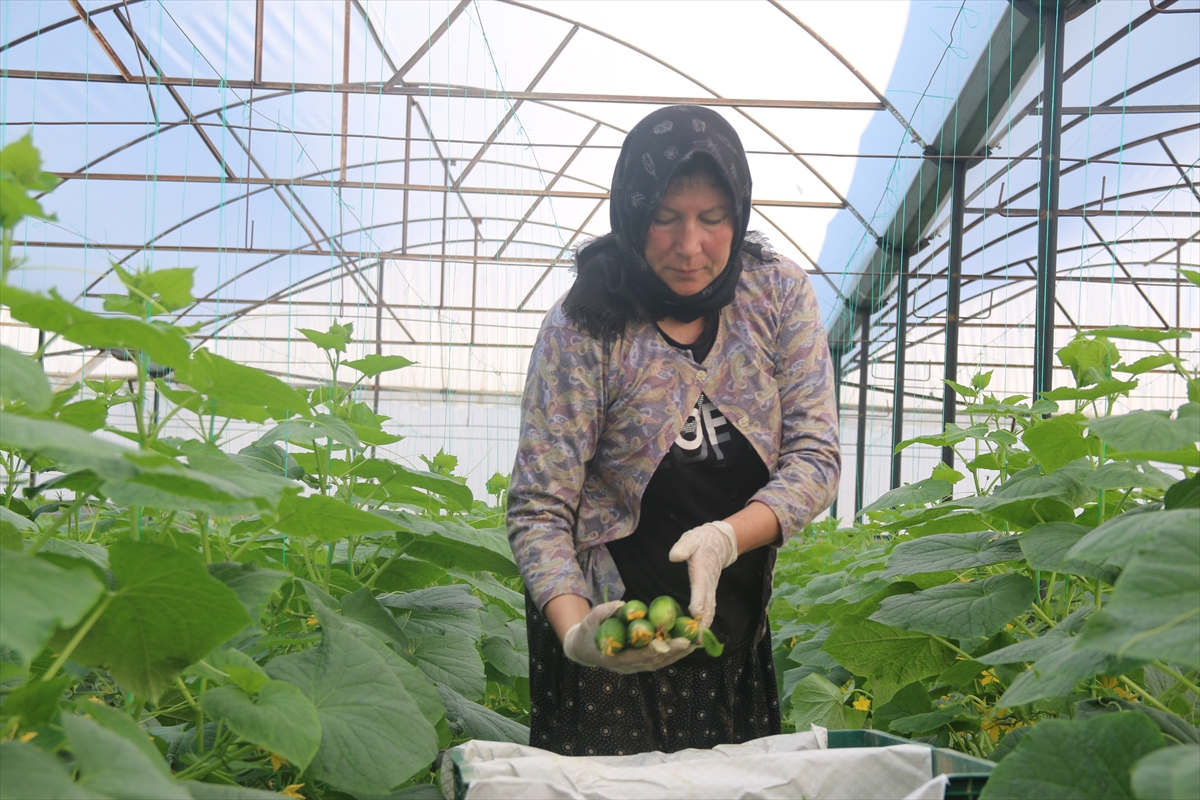 Çiftçiler, yaz aylarında sera içinde zaman zaman 50 dereceye yükselen sıcaklıkta diktikleri salatalıkları, 40 dereceye ulaşan sıcaklıkta hasat etti.