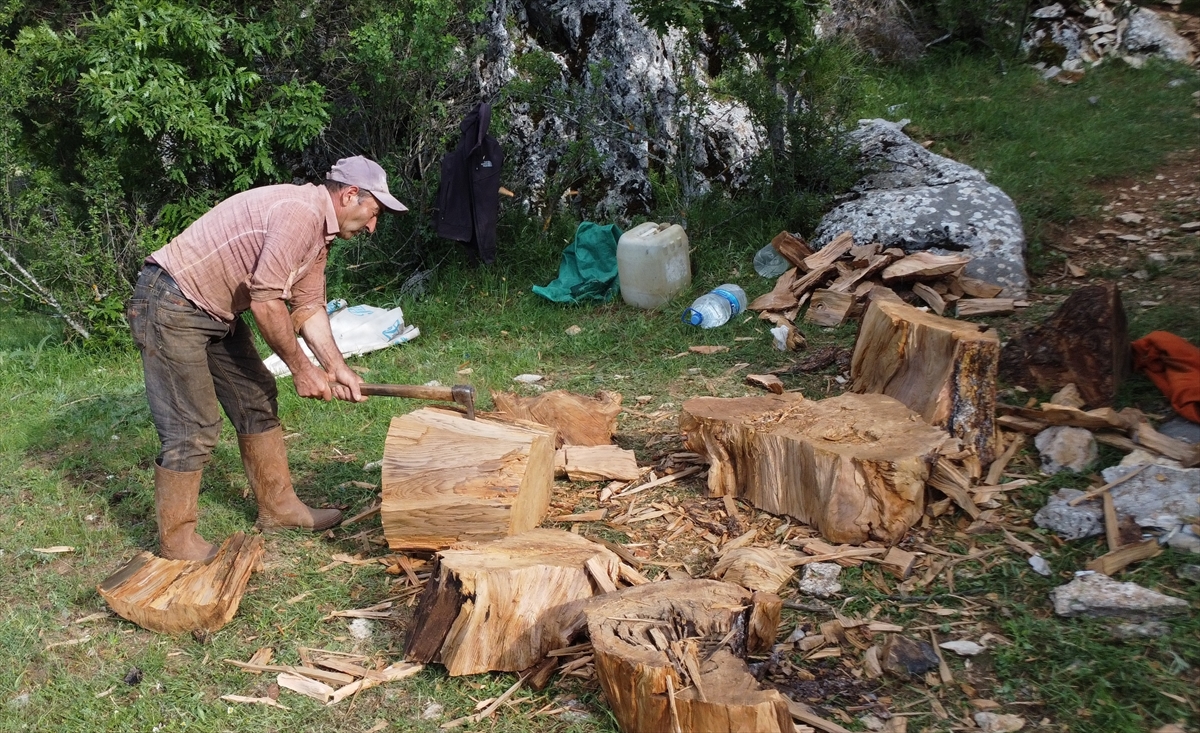 Kuyucak Mahallesi sakinleri, sedir katran yağı üretimi için bölgedeki 2500 rakımlı dağlarda yetişen sedir ağaçlarının kuruyan köklerini topraktan özenle çıkarıyor.