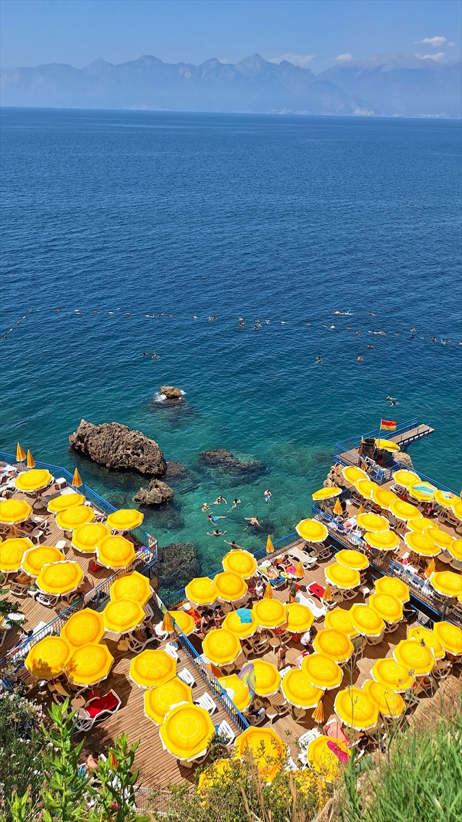 Metrelerce yükseklikteki falezlerin arasında yer alan plajlardaki iskelelerden atlayan ziyaretçiler, Akdeniz'in mavi sularında serinleme imkanı buluyor.