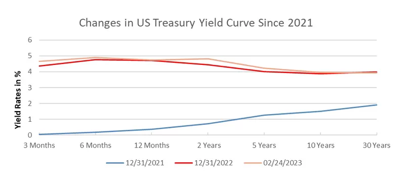 Above is how the US yield curve has changed over time. While it was upward sloping by end of 2021, as of February 24th it is inverted or sloped downwards. This means the short term interest rates are higher than the long term ones. In other words, the bond markets are expecting somewhat of a recession or economic slowdown over time.