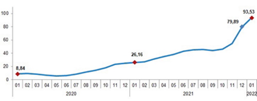 TÜİK tarafından açıklanan Ocak ayı ve yıllık enflasyon verilerine göre, sanayicinin ve diğer üreticilerin enflasyonu olarak bilinen Yurtiçi Üretici Fiyat Endeksi Yİ-ÜFE aylık % 10,45, yıllık %93,53 oranında arttı.