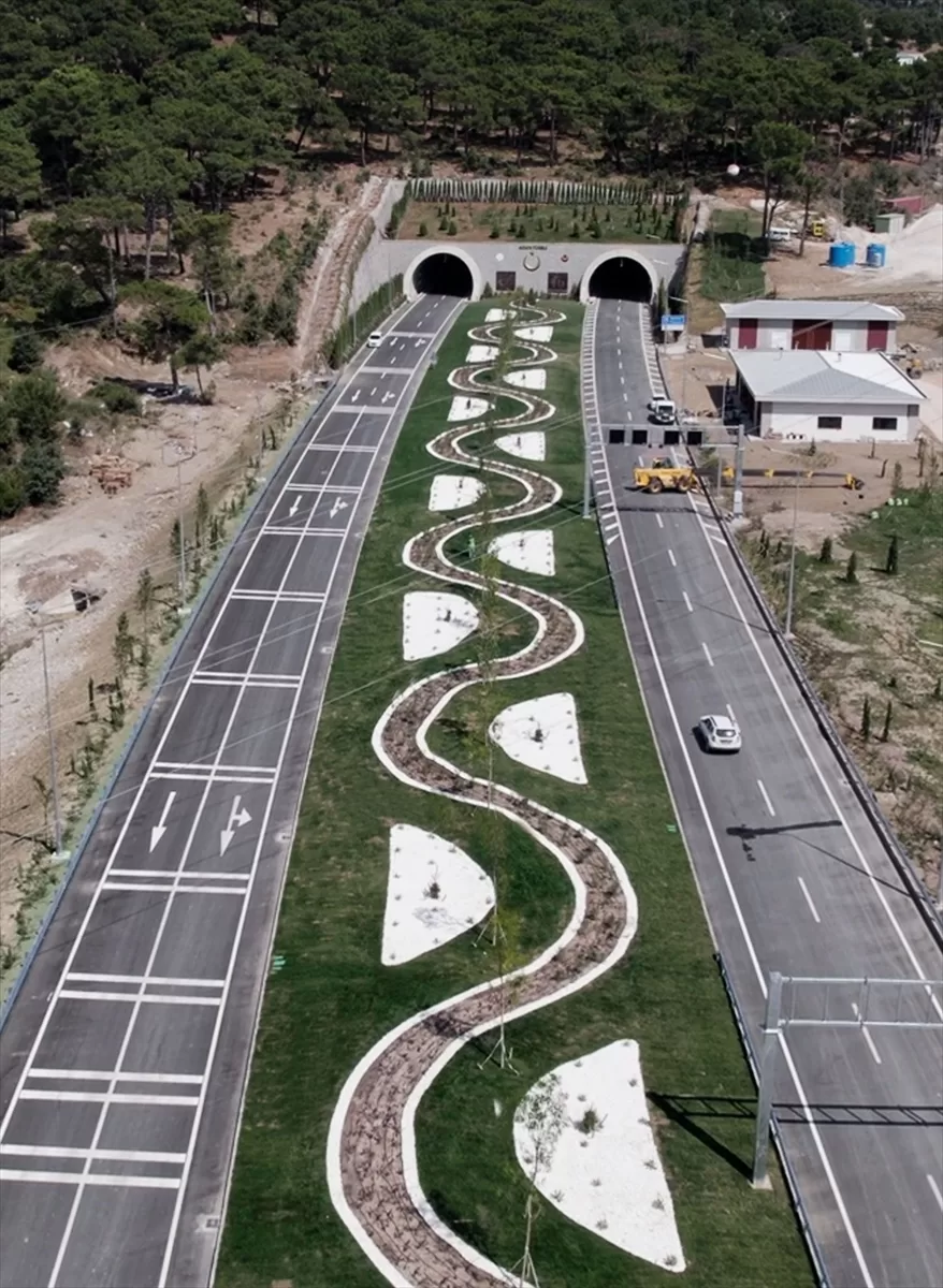 "Assos ve Troya tünelleri ile Kaz Dağları'nda yazın yoğun trafik, kışın mevsim şartları nedeniyle yaşanan sorunların önüne geçilmiştir. Yolun fiziki ve geometrik standartlarını yükselten proje ile güzergahtaki trafik güvenliği ve sürüş konforu artırılmıştır. 9,6 kilometrelik yol kesiminin 5,7 kilometresi tünellerle geçilerek, Kaz Dağları'nın doğasının korunması sağlanmıştır. Ayrıca, güzergah üzerinde belirlenen noktalarda 1575 metrelik motosiklet koruyucu otokorkuluk sistemi monte edilerek motosiklet trafiğinin güvenliği artırılmıştır."