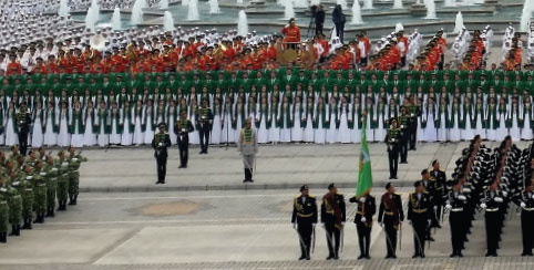 Savunma Bakanı Begenç Gündoğdiyev‘in, kara, deniz ve hava kuvvetleri birliklerine ait askeri birlikleri selamlamasının ardından Türkmen milli marşı okundu ve Türkmenistan bayrağı göndere çekildi. Törene katılan davetliler, askeri birliklerin geçişini alkışlarla izledi. Yabancı heyetlerin de katıldığı resmi kutlama töreninde Türkmenistan Devlet Başkanı Gurbangulı Berdimuhamedov, askerleri ayakta selamladı. Askeri geçitle birlikte hava kuvvetlerine ait uçakların gösterisi de büyük ilgi gördü. Bağımsızlık Bayramı dolayısıyla Türkmen Lider‘e, Bakanlar Kurulu üyeleri tarafından Ahal-Teke atı hediye edildi. At gösterisinden sonra ülkenin çeşitli kurumlarında çalışanlar meydandan geçerek, devlet başkanını selamladı.