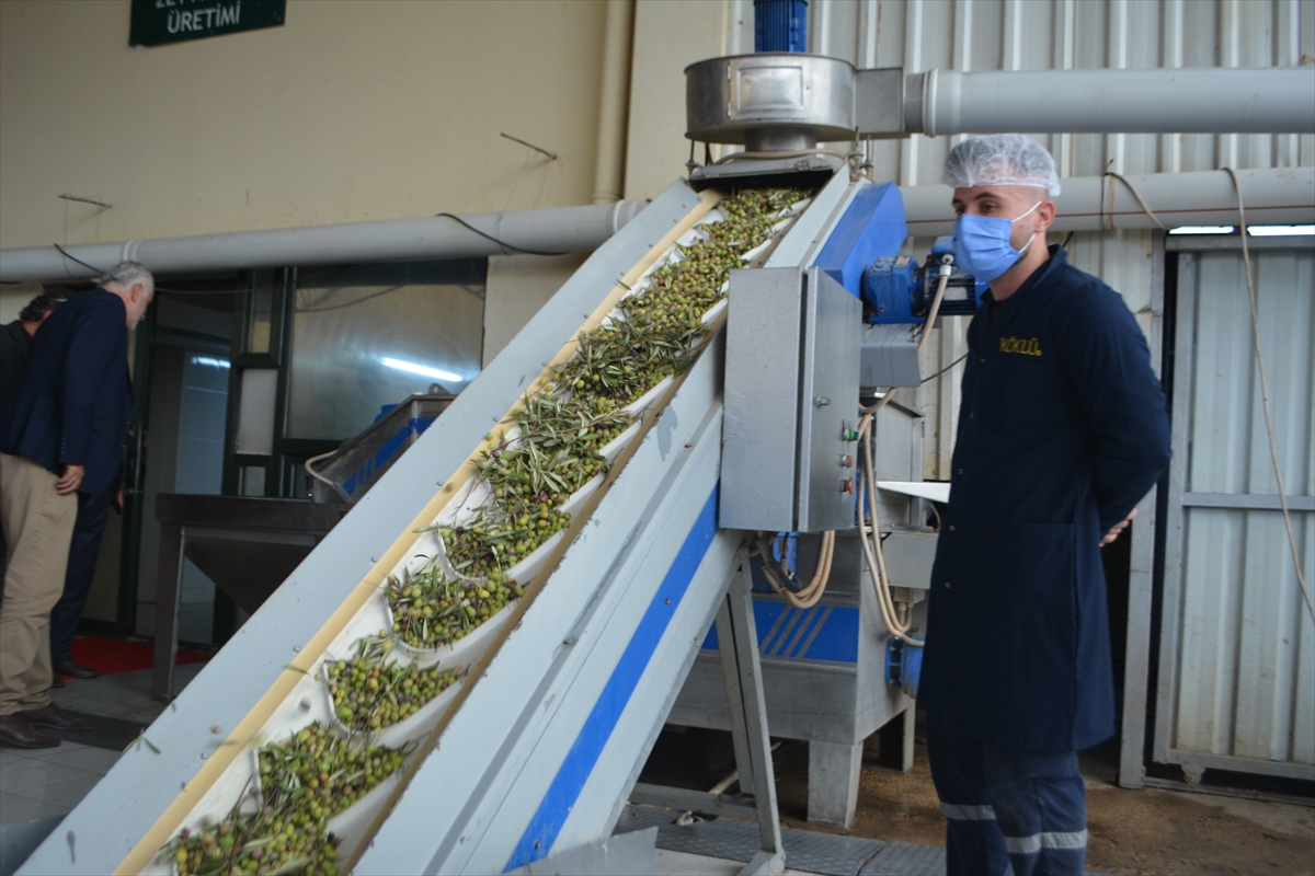Sıkım öncesinde, firmanın zeytinliğinde yılın ilk zeytin hasadını da yapan Şıldak ve beraberindekilere, zeytinin yağa dönüşen serüveni gösterildi.