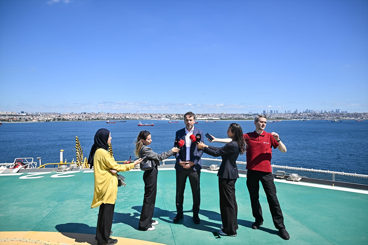 Bakan Bayraktar, İstanbul Boğazı'nı geçerek Karadeniz'e çıkacak Abdülhamid Han sondaj gemisinde basın mensuplarına açıklama yaptı.