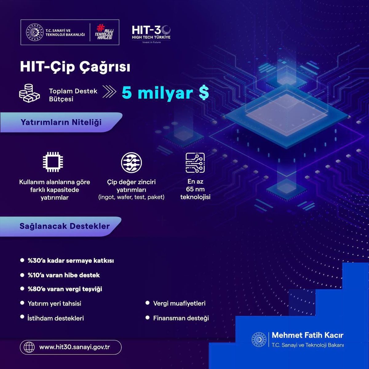 "HIT-30 Yüksek Teknoloji Yatırım Programı'yla ülkemizde 65 nanometre ve altı çip üretimini gerçekleştirmeyi amaçlıyoruz. Sermaye katkısı ve hibe destekleri de içeren 5 milyar dolarlık kaynakla, otomotiv, beyaz eşya, elektronik, savunma ve havacılık gibi alanlarda ihtiyaç duyduğumuz çiplerin Türkiye'de üretilmesini sağlayacağız. Yapay zekanın gelişimiyle birlikte hızla büyüyen bu alanda Türkiye olarak kendi ihtiyaçlarımızı karşılayacak ve ihracat kabiliyeti geliştireceğiz."