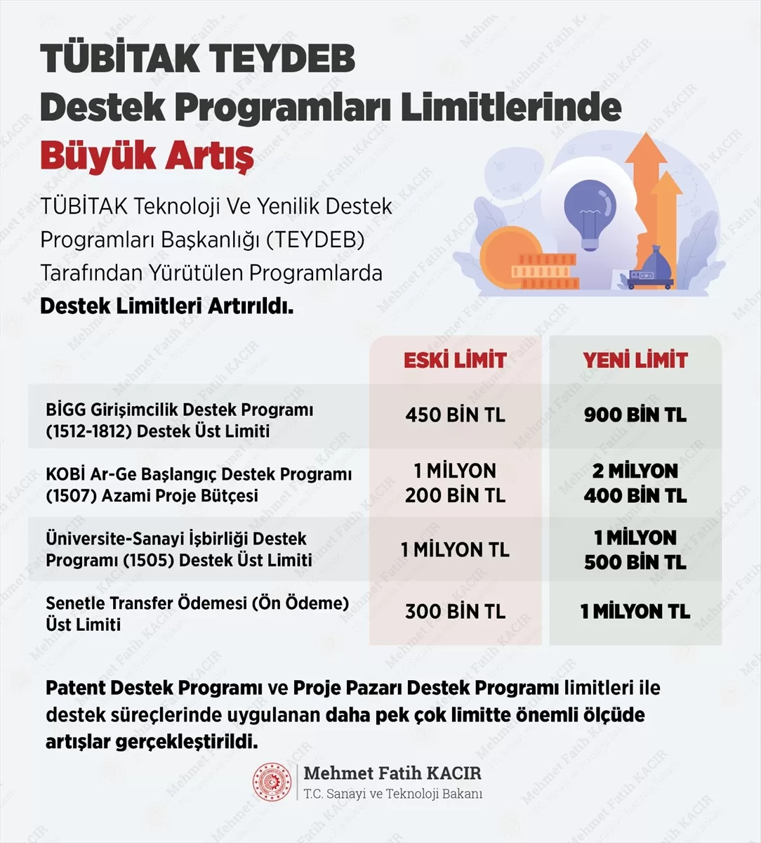 ANKARA (AA) – Sanayi ve Teknoloji Bakanı Mehmet Fatih Kacır, TÜBİTAK Teknoloji ve Yenilik Destek Programları Başkanlığı (TEYDEB) tarafından yürütülen destek programları üst limitlerinin artırıldığını belirtti.