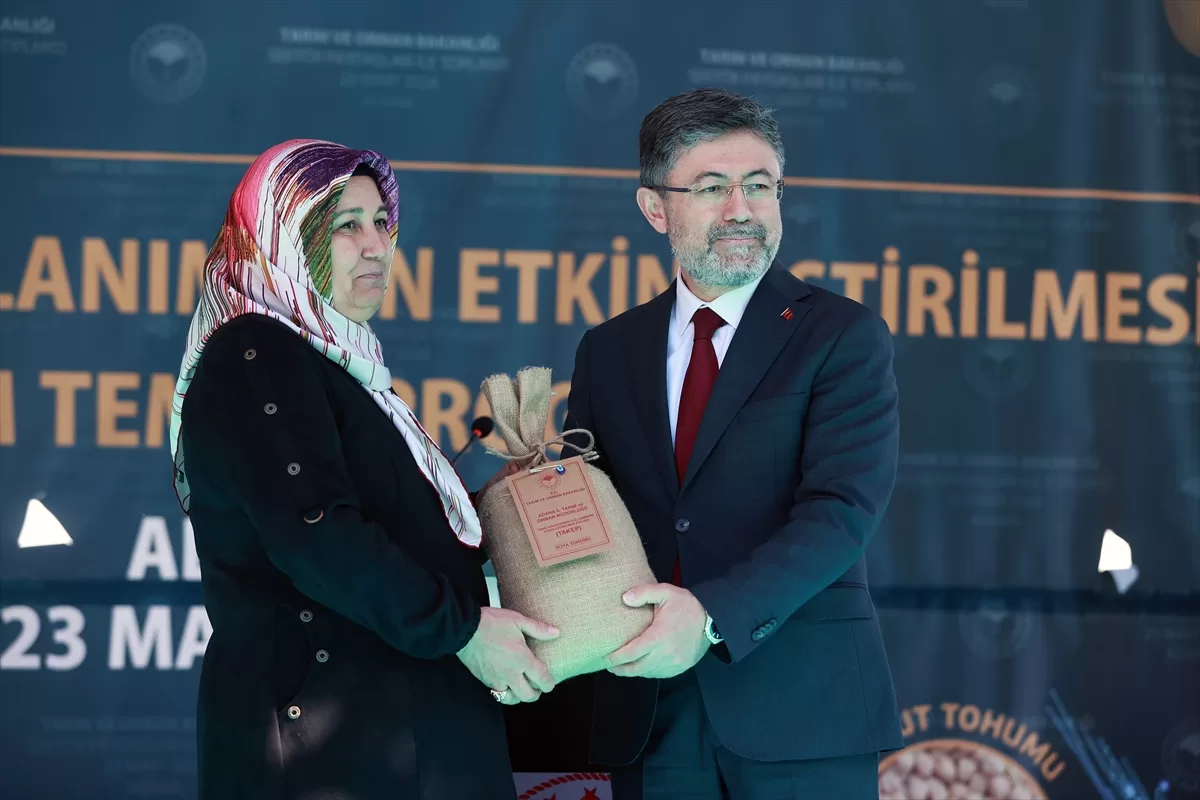 Konuşmaların ardından Bakan Yumaklı ve diğer katılımcılar, çiftçilere soya tohumu verdi.