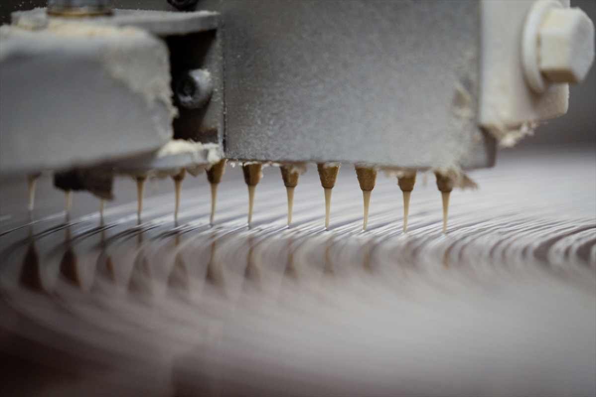 Makineden çıkartılan ince hamurun tek tek tepsiye yerleştirildiğini belirten Altunbay, kat kat tepsiye alınan bu hamurların kesme işleminden sonra yağlandığını ifade etti.