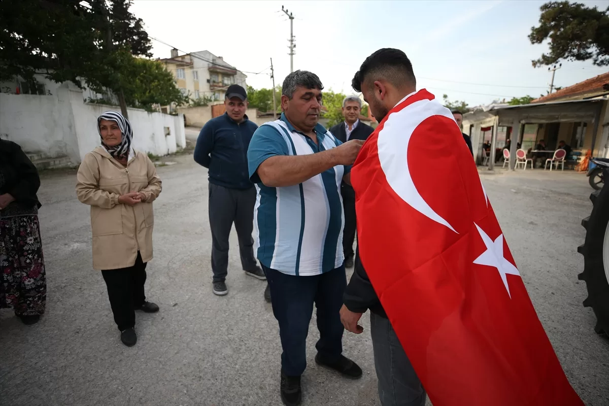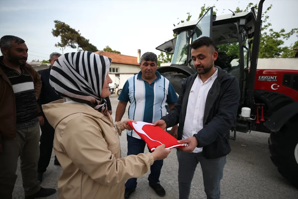 Anne Mücevher Kahraman da mahalle meydanında dua edilmesinin ardından oğluna Erdoğan'a götürmesi için Türk bayrağı, yumurta ve köy ekmeği verdi.
