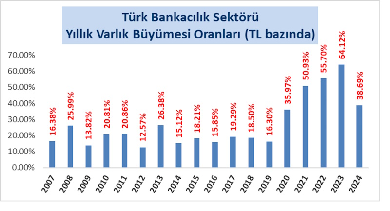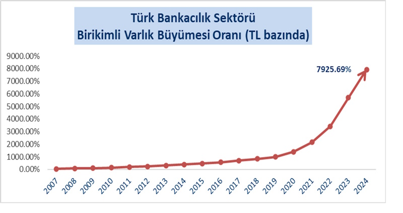 Bu çalışmada ağırlıklı olarak BDDK-Bankacılık Düzenleme ve Denetleme Kurumu’nun aylık periyotlarla yayımladığı sayısal veriler ile TBB-Türkiye Bankalar Birliği’nin ve TKBB-Türkiye Katılım Bankaları Birliği’nın yayımladıkları istatistikler esas alındı. Türk bankacılık sistemi son 18 yılda TL bazında her yıl istisnasız olarak büyüme gösterdi. 2007-2024 yılları arasında birikimli olarak %7925 oranında büyüme gösterdi.