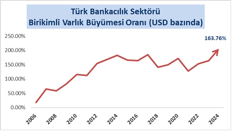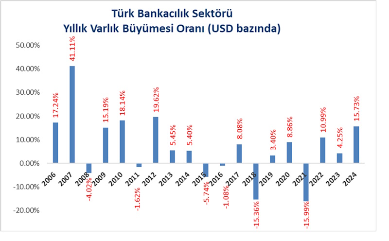 2005 yılında 303 milyar dolar olan büyüklüğü, 2020 yılında 823 milyar dolara ulaştı. 2021 yılında ise dolar bazında büyüklüğü 691 milyar dolar büyüklüğüne geriledi. 2024 yılında ise bu rakam 925 milyar dolara ulaştı. Türk lirasının dış değerindeki ani ve yüksek kırılganlıklar nedeniyle bankacılık sektörünün TL bazında istikrarlı büyümesinin aksine, 2005-2024 yılları arasında dolar bazındaki büyümesi, 2009, 2012, 2015, 2016, 2018, 2021 yıllarında negatif, diğer 10 yılda da pozitif oldu. Büyümede oluşan inişli çıkışlı serinin nedeni TL’nin dış değerindeki ani kırılganlıklardır. 2021 yılından itibaren TL’nin değerinde yaşanan tahribatlar nedeniyle Türk bankacılık sektörünün dolar bazındaki büyüklüğü 10 yıl geriye giderek 2012 yılında ulaştığı büyüklüğe geri döndü. Ancak 2023 yılındaki döviz kurlarındaki oynaklığa rağmen dolar bazında bankacılık sektörü baz etkisiyle %4,12 oranında büyüme kaydetti. 2024 yılında dolar bazında %15,73, TL bazında ise %38,69 yıllık büyümesinin olduğu göz önünde bulundurulur ise TL’nin yaşadığı tahribatın hala devam ettiği çok daha iyi anlaşılacaktır.