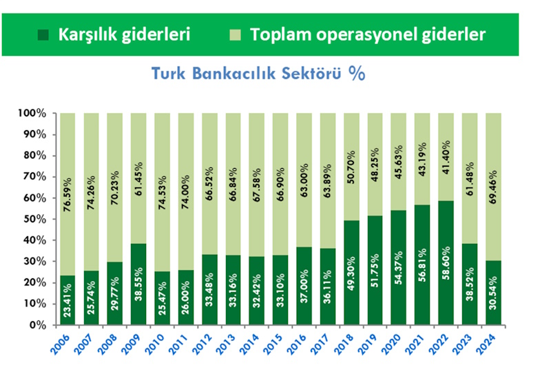 Kredilerde başlayan tahsilat sorunlarına dayalı olarak, son üç yılda artış trendine giren karşılık giderlerinin toplam giderler içerisinde en yüksek paya 2022 yılında ulaştı. 2005-2017 yılları arasında karşılık giderlerinin toplam operasyonel giderler içerindeki payı ortalama %31,25 civarında iken, 2022-2018 yılları arasında bu oran %58,36 seviyesine yükseldi. Ancak bir önceki yıla göre 2024 yılında ayrılan karşılık giderleri düşen karlılık oranları paralelinde göreceli olarak düşmüş ve toplam opersyonel giderlerin % 30.54’ünü oluşturdu.