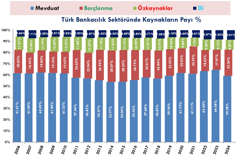 Türk bankacılık sektöründe en önemli ve belirleyici kaynak sıralaması, büyükten küçüğe doğru mevduat, borçlanma ve öz kaynak kalemleridir. 2024 yılında da bu sıralama değişmemekle birlikte mevduatın payı, borçlanma kalemindeki artışa bağlı olarak bir miktar azaldı. Mevduat dışı borçlanma kalemleri içerisinde 2019 yılında başlayan düşme eğilimi, 2024 yılında tekrar artışa başladı. Bu artışta küresel fonların yönünün birazcıkta olasa netleşmesi etkili oldu. Ancak öz kaynakların payında 2022 yılında artan karlılıkla birlikte artış olmasıan rağmen 2024 yılında özkaynakların payı yeterince artmamış mevcut seyrini korudu.