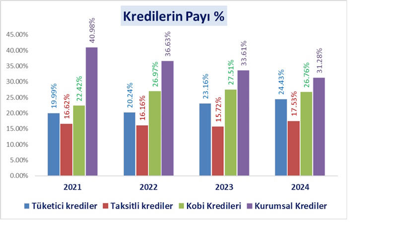 2024 YILINDA TÜKETİCİ VE TAKSİTLİ KREDİLERİN PAYLARI ARTTI, KOBİ KRİDİLERİNİN PAYI DÜŞTÜ