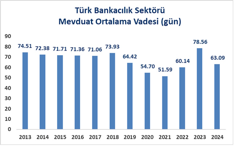 Türk bankacılık sektöründe ana kaynak olan mevduatın ortalama vadesi üç ayın altında (hatta iki ayın) olması likidite yönetimini zorlamakta ve maliyet seviyesini artırıyor. Üstelik son üç yılda mevduatın ortalama vadesi de düşme eğilimine girdi. 2018 yılında mevduatın ortalama vadesi 73,93 gün iken, 2021 yılında bu ortalama vade 51.59 güne geriledi. Ancak, 2022 yılında asgari vadesi 3 ay olarak belirlenen KKM nedeniyle kayden de olsa mevduat vade ortalaması 60.14 güne, 2023 yılında da 78.56 güne yükselmiştir. Ancak, 2024 yılında mevdurtaın ortalama vadesi 63.09 güne düşmüş durumda.