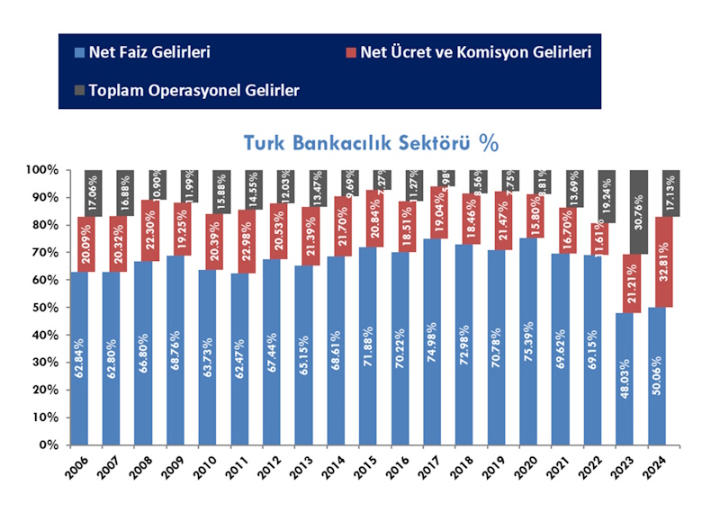 Türk bankacılık sektörünün net faiz gelirlerinin toplam gelirler içerisindeki payı 2023 yılında düştü ve %50,06 olarak gerçekleşti. 2023 yılına kadar son 18 yılın ortalaması %19,59 civarında iken, 2024 yılında komisyon gelirlerinin payı da %32,81 seviyesine yükseldi. Bu yükselişin temel nedeni işlem hacminin artışından ziyade bankacılık hizmetlerinin daha pahalı hale getirilmiş olmasıdır. Ancak yine de, operasyonel giderler/operasyonel gelirler oranının uluslararası ortala seviyenin altında seyretmesi Türk bankacılık sisteminin ayırt edici pozitif özelliklerinden biri olarak hala devam ediyor.