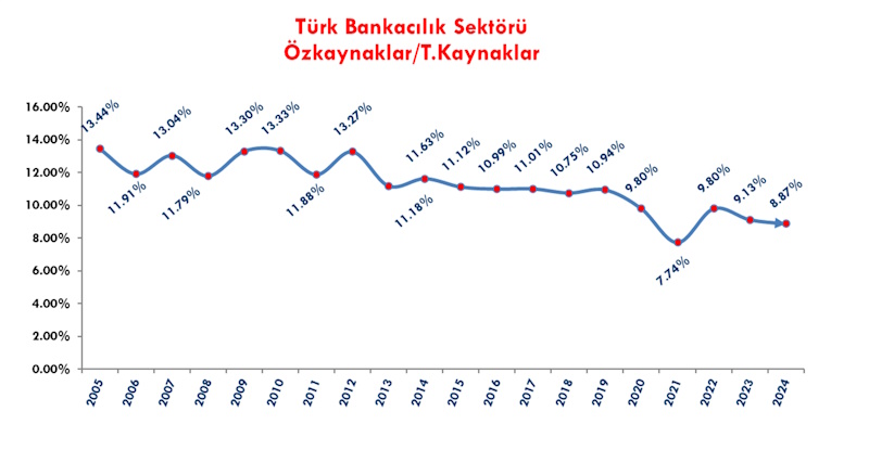 Türk bankacılık sektörünün büyümesine 2021 yılına kadar öz kaynaklar aynı hızda eşlik edemedi. Zira öz kaynaklarının toplam kaynaklar içerindeki payı 2005 yılından itibaren ana eğilim olarak düşmeye devam ediyor. Örneğin 2005 yılında %13,44 olan Özkaynak/Toplam kaynak ilişkisi, 2021 yılında %7,74 seviyesine kadar geriledi. Ancak, Merkez Bankası’nın 2022 yılındaki faiz, kur politikalarına bağlı olarak bankacılığın artan karlılığının yardımıyla özkaynaklar 2022 yılında tekrar artış göstermeye başladı. 2022 yılında Türk bankacılığının özkaynaklarının toplam kaynaklar içerisindeki payı % 7.74’ten % 9.81 seviyesine yükseldi. 2023 yılında ise bir önceki yılda gerçekleşen karlılığa ulaşılamadığı için sözkonusu rasyo tekrar gerilemeye başladı ve %9,02 olarak, 2024 yılında da %8.87 olarak gerçekleşti.