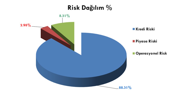 2023 yılı itibariyle kredi riskinin payı %88,51, piyasa riskinin payı %2.98 ve operasyonel riskin payı ise %8,51 olarak gerçekleşti.