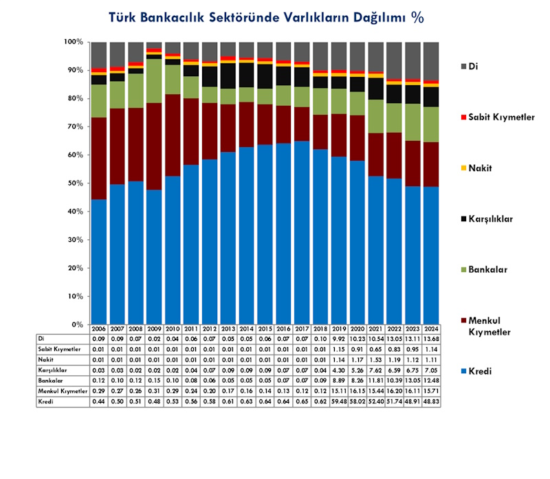 Türk bankacılık sektörünün varlık sıralaması yönünden en büyük kalem %48,83 lik bir payla kredilerdir. Ancak, kredi kaleminin payı 2017 yılında ulaştığı %64,95 oranındaki payı devam eden yıllarda her yıl aşağılara düşerek 2024 yılında %48,83 oranına kadar geriledi. Kredilerden sonra ikinci büyük kalem %15,71 payla menkul kıymetler, üçüncü büyük kalem ise %12,48 payla bankalardan alacaklar kalemi oldu. 2011 yılından itibaren Türk bankacılık sektöründe kredi/mevduat rasyoları %100 seviyesinin üzerinde seyretmekte iken, 2019 yılında %100 seviyesine, 2020 yılında da %94 seviyesine, 2021 yılında da %86 seviyesine, 2022 yılında ise %81 seviyesine, 2023 yılında da % 76 seviyesine indi, 2024 yılında da artış eğilimine girerek tekrar % 82 seviyesine çıktı. Bilanço riskleri bu açıdan bir miktar dengelendi. Buradaki dengelenmenin sebebi kredi risklerindeki düşüş değil, mevduat kaleminde (özellikle dövizli ve dövize endeksli mevduatlarda) 2020 yılından itibaren yaşanmaya başlanan hızlı artışların 2024 yılında zayıflamasıdır.