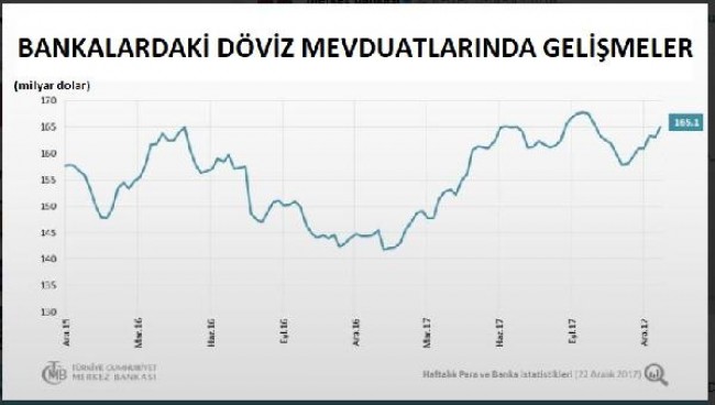 Bankalardaki kıymetli maden depo hesapları dahil döviz mevduatı geçen hafta 2.05 milyar dolar birden artışla 165.09 milyar dolara çıktı.
