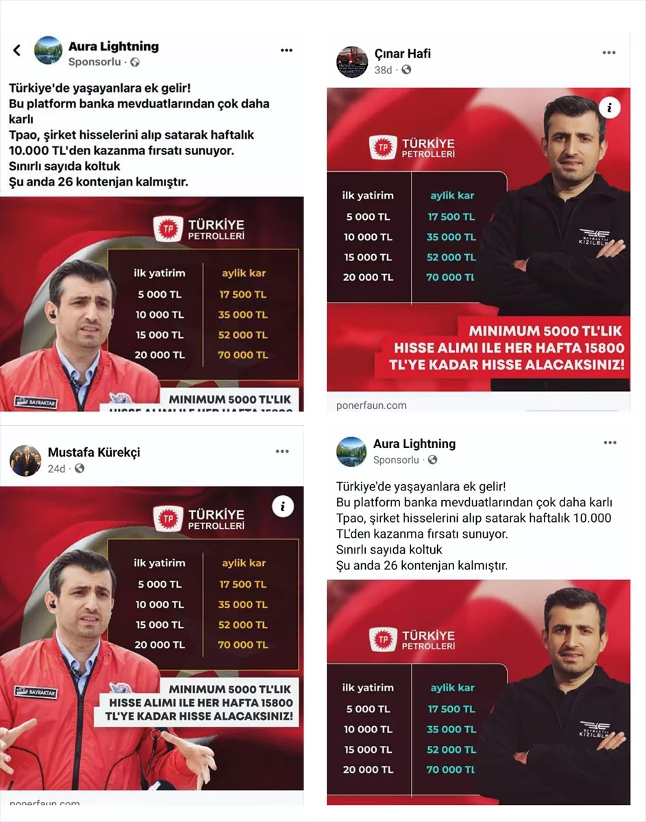 İSTANBUL (AA) – Baykar tarafından, Türkiye Petrolleri Anonim Ortaklığı'nın (TPAO) adı ve Baykar Yönetim Kurulu Başkanı Selçuk Bayraktar'ın fotoğrafları kullanılarak "yatırım fırsatı", "ek gelir" gibi başlıklarla yayınlanan ilanların açık bir dolandırıcılık girişimi olduğu bildirildi.