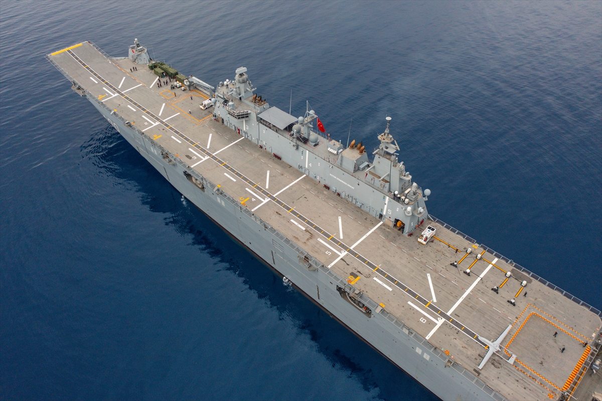 Atışlar sonrası Bayraktar TB3 SİHA'lar TCG Anadolu çevresinde kol uçuşu ve selamlama geçişi icra edecek.