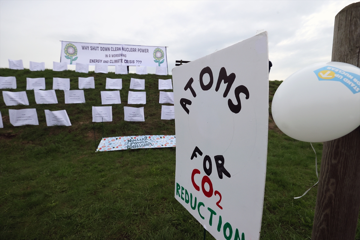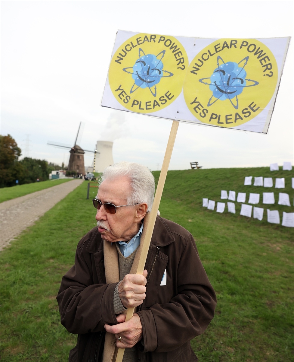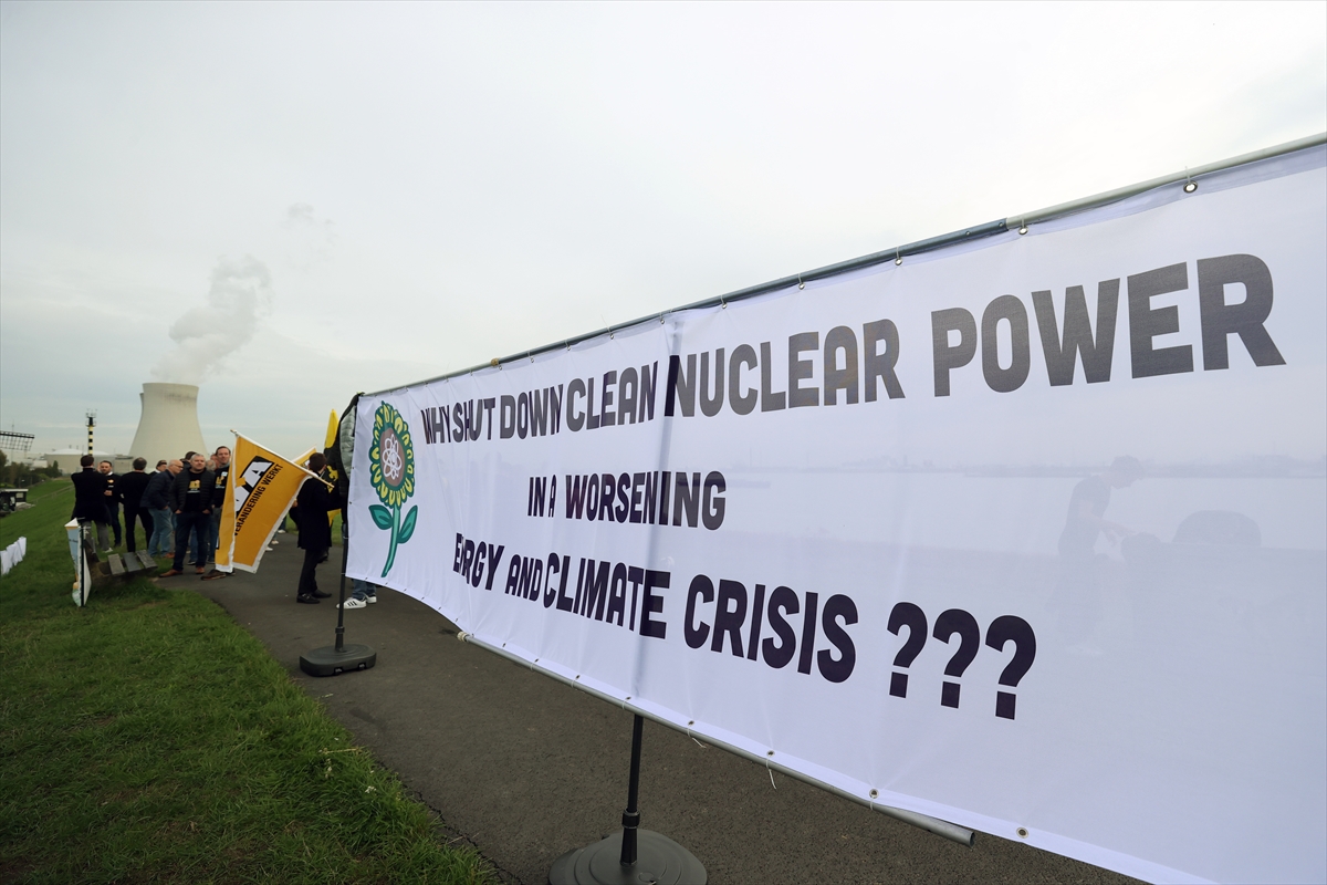 "Nükleerden çıkışa son verin" yazan kıyafetler giyen protestocular, enerji krizi yaşanan bir ortamda reaktörün faaliyet süresinin uzatılması gerektiğine dikkati çekti.
