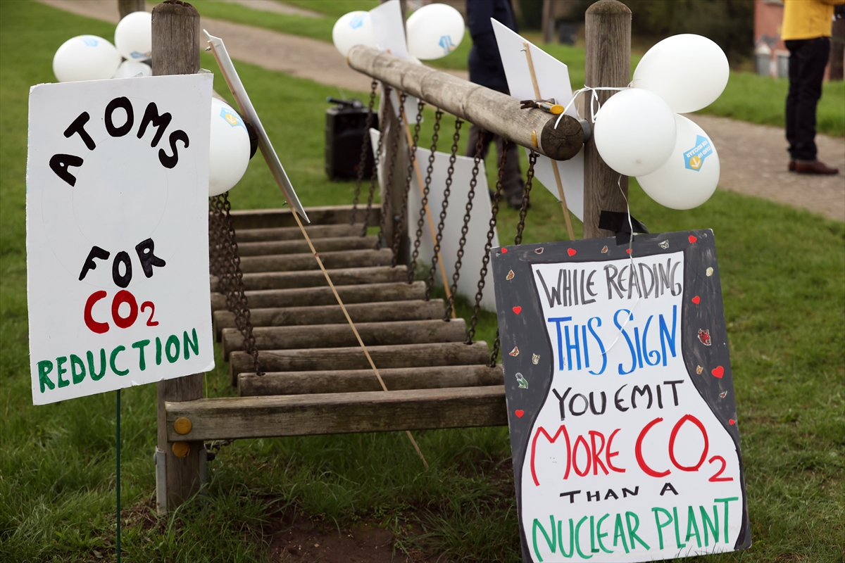 Göstericiler, "Enerji ve iklim krizinde neden nükleer santrali kapatıyorsunuz" yazılı büyük bir afiş astı.