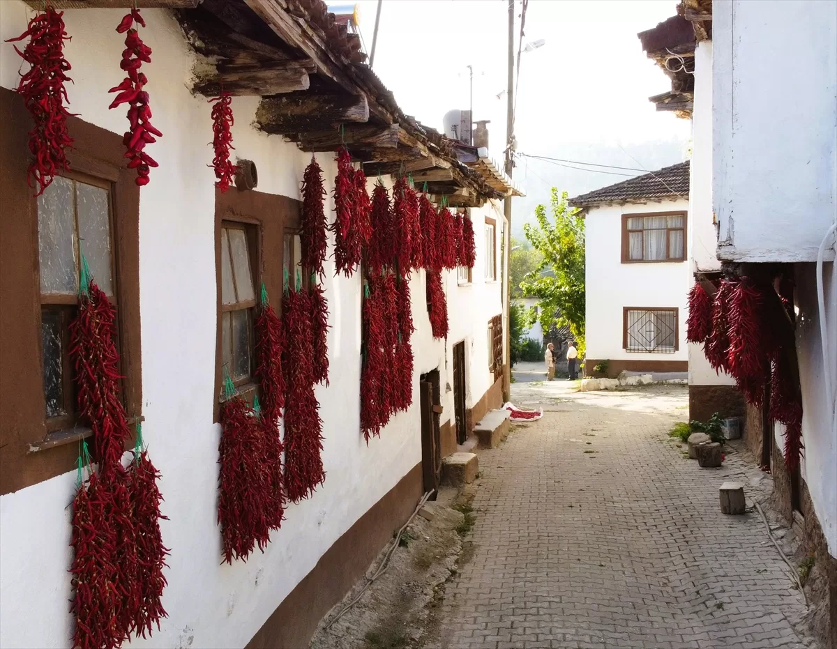Bilecik Valisi Şefik Aygöl, beraberindeki protokol üyeleriyle, köyde duvar ve balkonlarda kurutulan biberleri inceledi.
