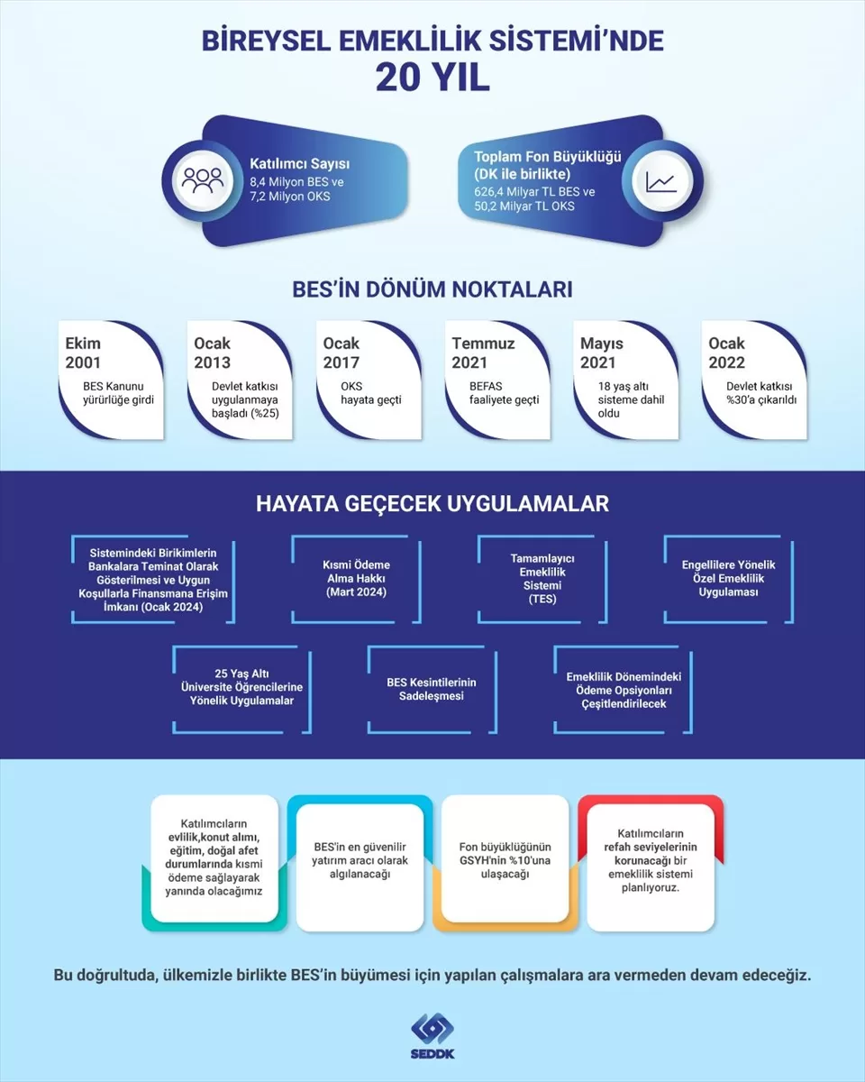 BES'in 20 yılda geldiği noktaya ilişkin son veriler, Sigortacılık ve Özel Emeklilik Düzenleme ve Denetleme Kurumu (SEDDK) tarafından yapılan infografikle paylaşıldı.