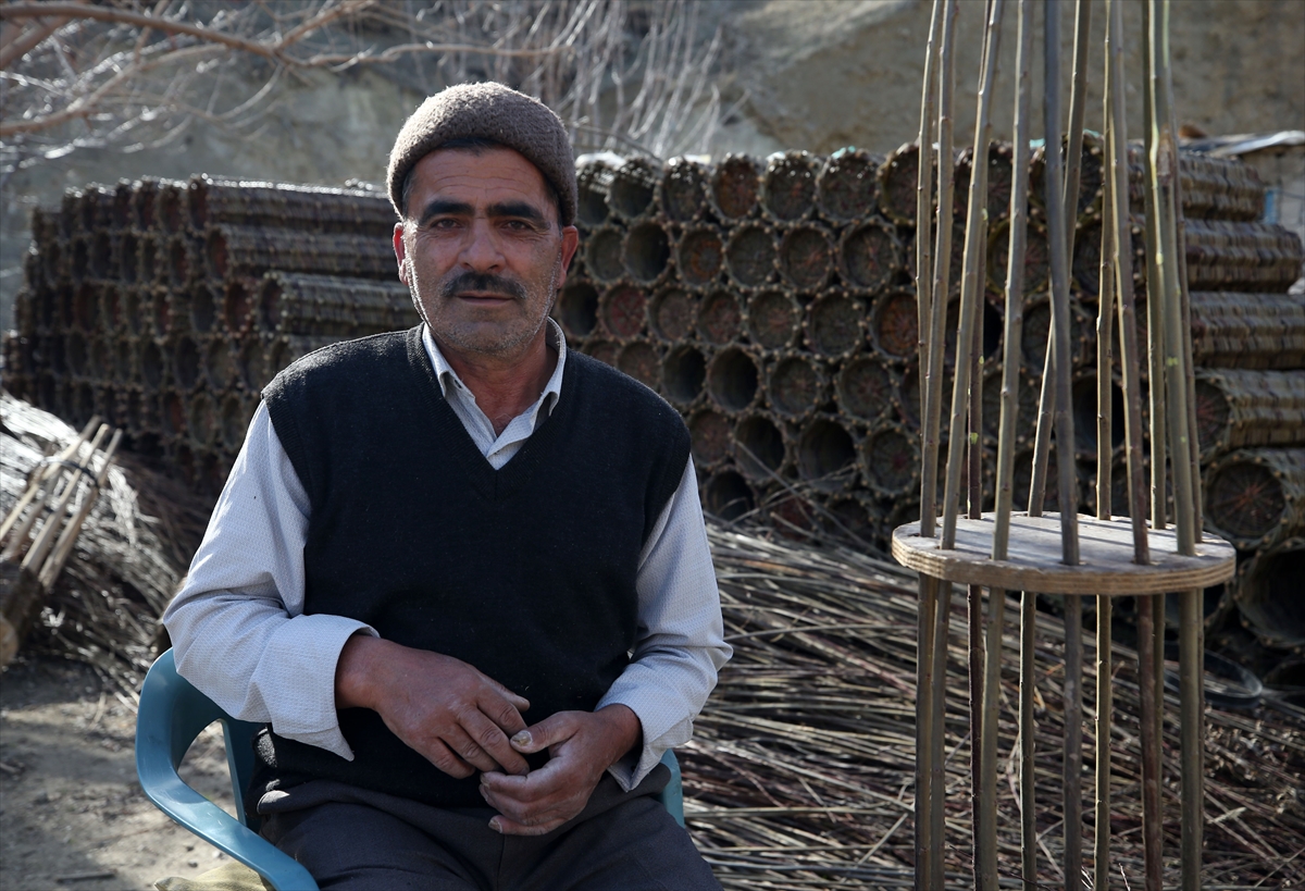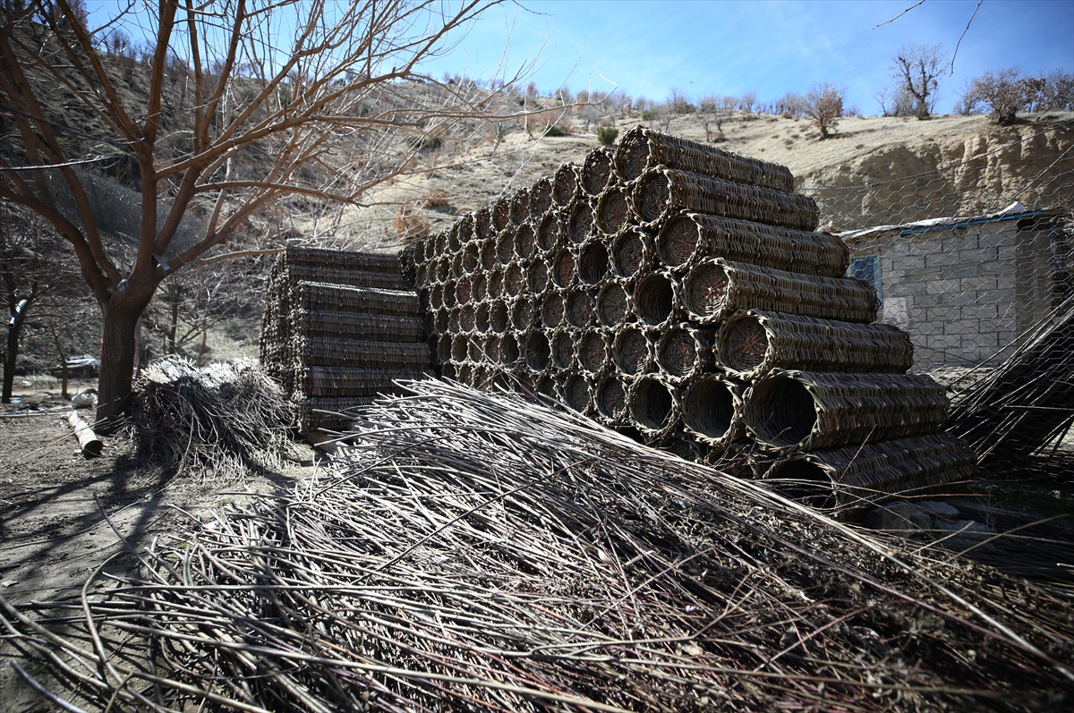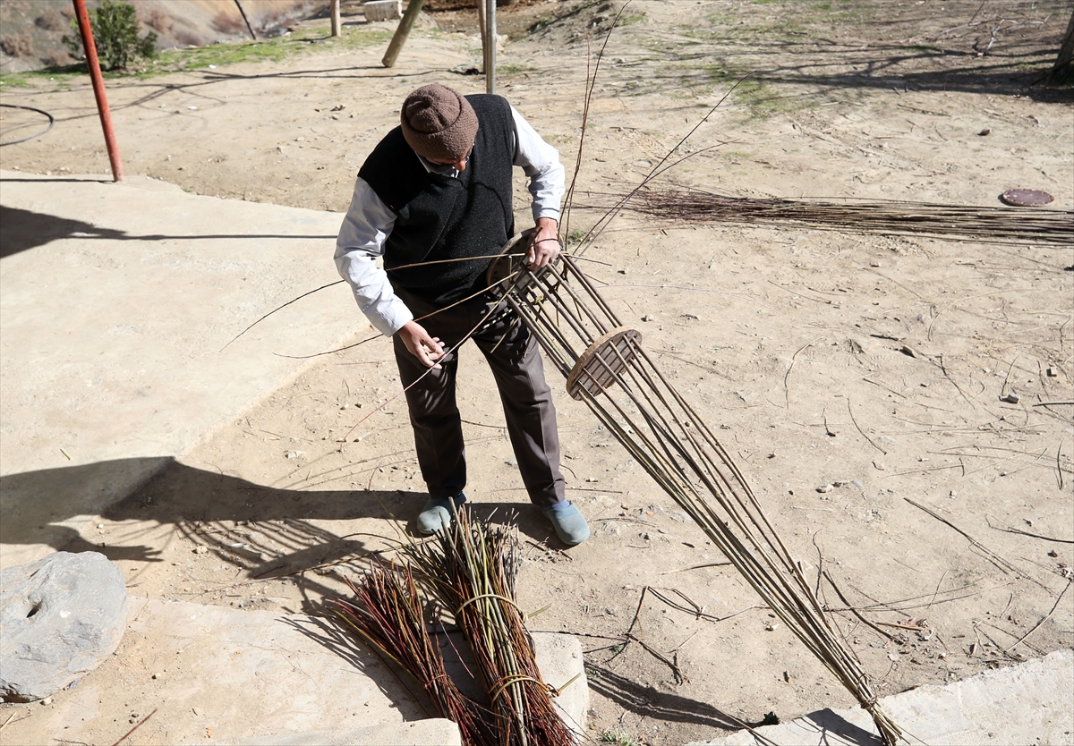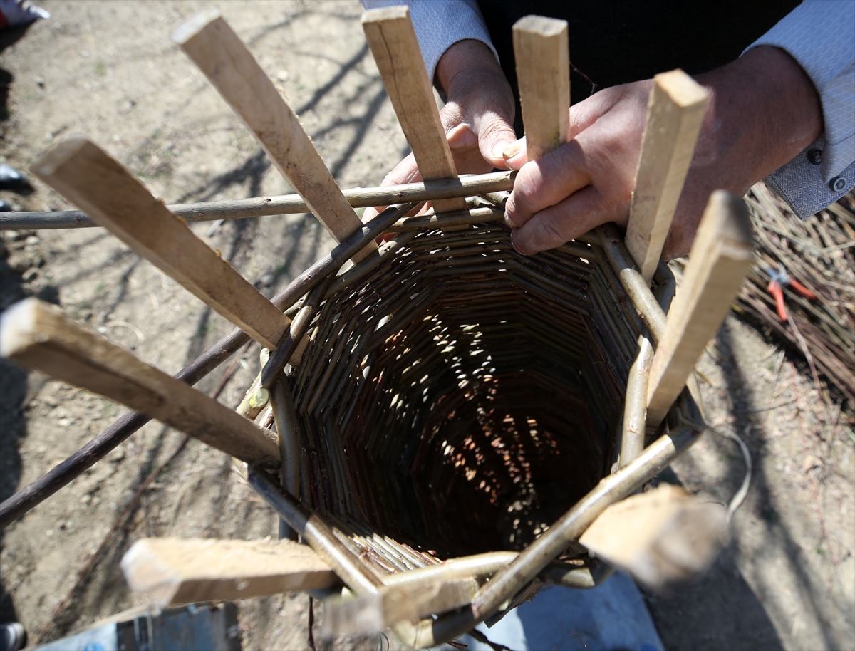 Sonbaharda dere kenarından topladığı söğüt ağacının ince dallarını yapraklarından ayırarak daha esnek olmaları için kışın kar altında bekleten Yalçın, ilkbaharda evinin bahçesinde onları ilmek ilmek örerek sepet yapıyor.