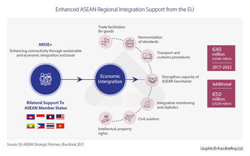 Avrupa Birliği, ASEAN bölgesinde 7,6 milyar dolarlık tutarla ABD’den sonra en büyük doğrudan yatırımcı durumundadır. AB ile ikili ticaretin toplamı, 2020 yılında 258 milyar dolara ulaşmıştır.