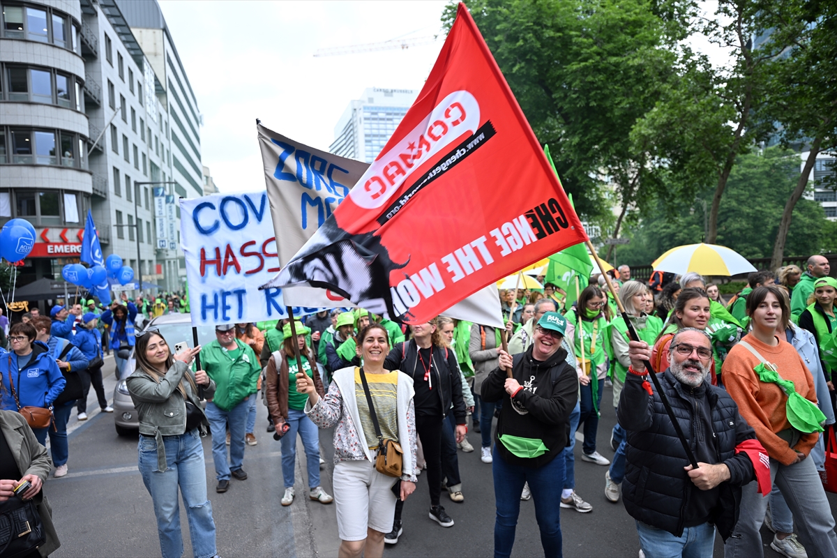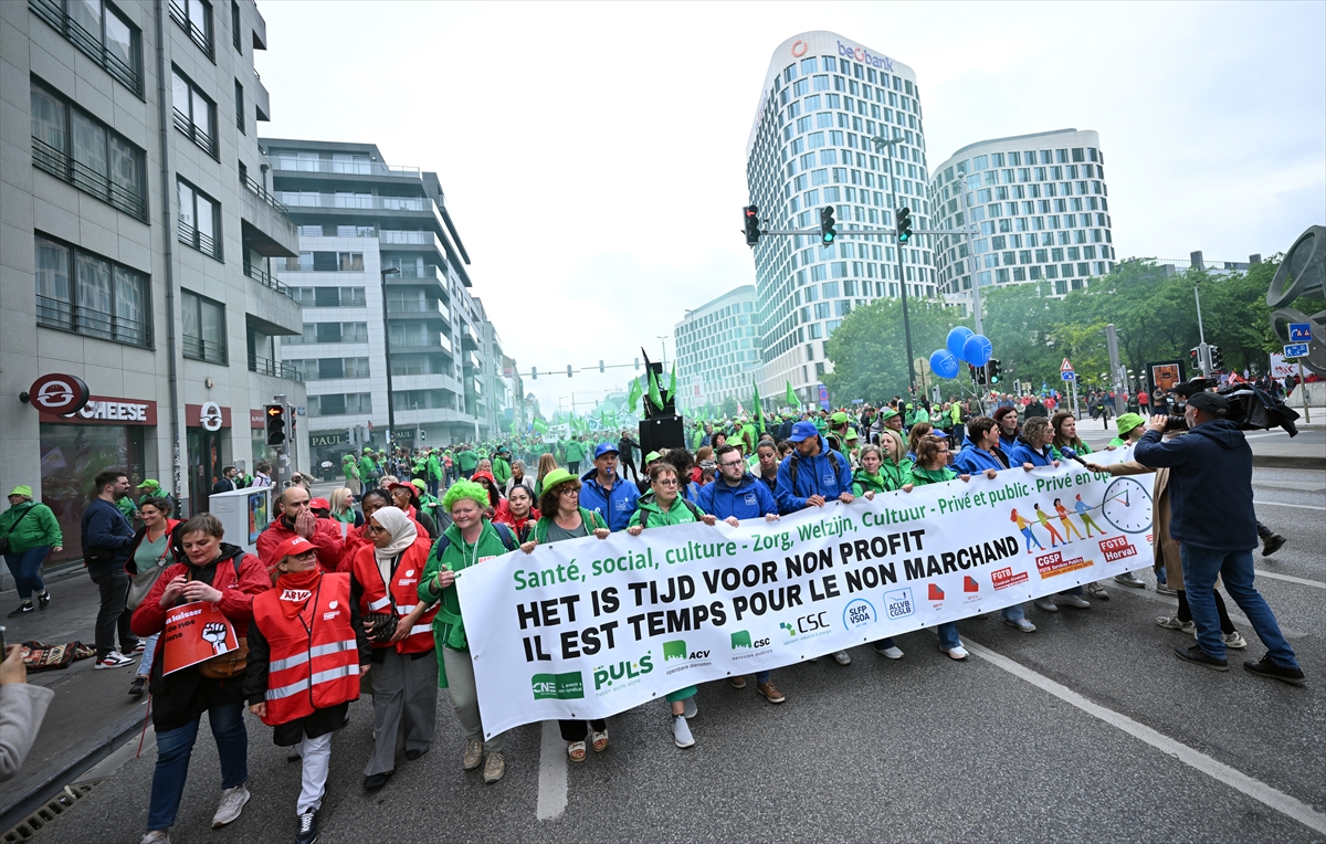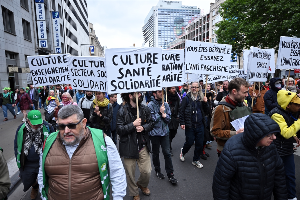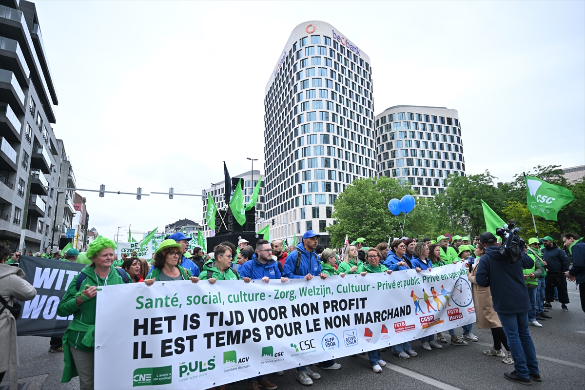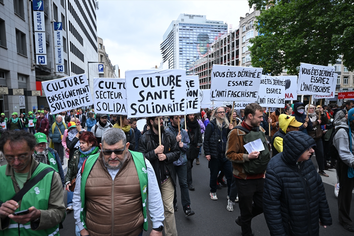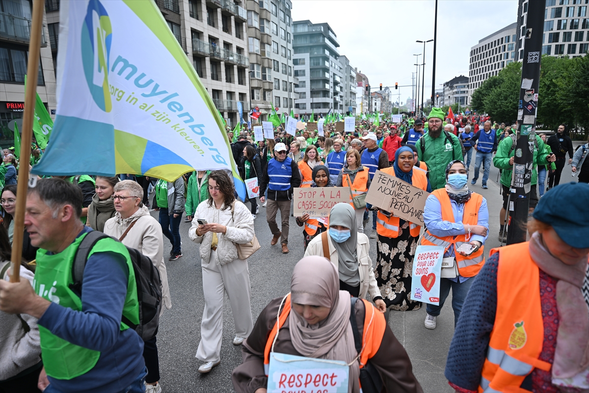 Ülkedeki çeşitli sendikaların çağrısıyla kar amacı gütmeyen sektörler olan sağlık, sivil toplum kuruluşları, kültür ve sanat gibi alanlarda çalışan yaklaşık 15 bin kişi, Brüksel'deki Kuzey Tren İstasyonu önünde toplandı.