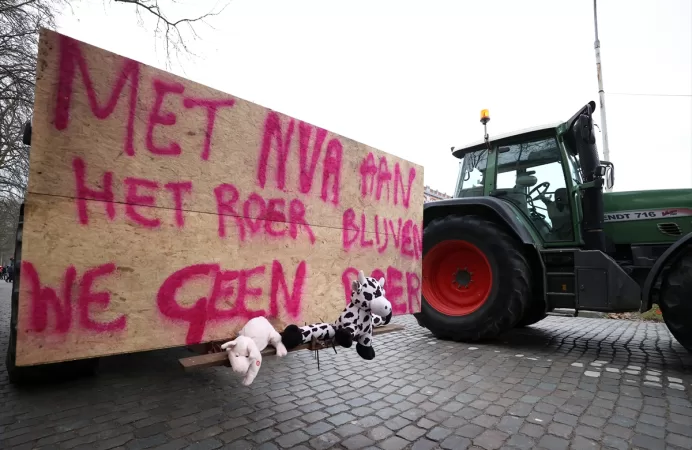 Flaman Bölgesi hükümetinin tarım sektöründe 2025 yılına kadar nitrojen (azot) salımını sınırlama planına karşı çıkan göstericiler, "Çiftçi yoksa gıda ve gelecek yok" yazılı afişler astı.