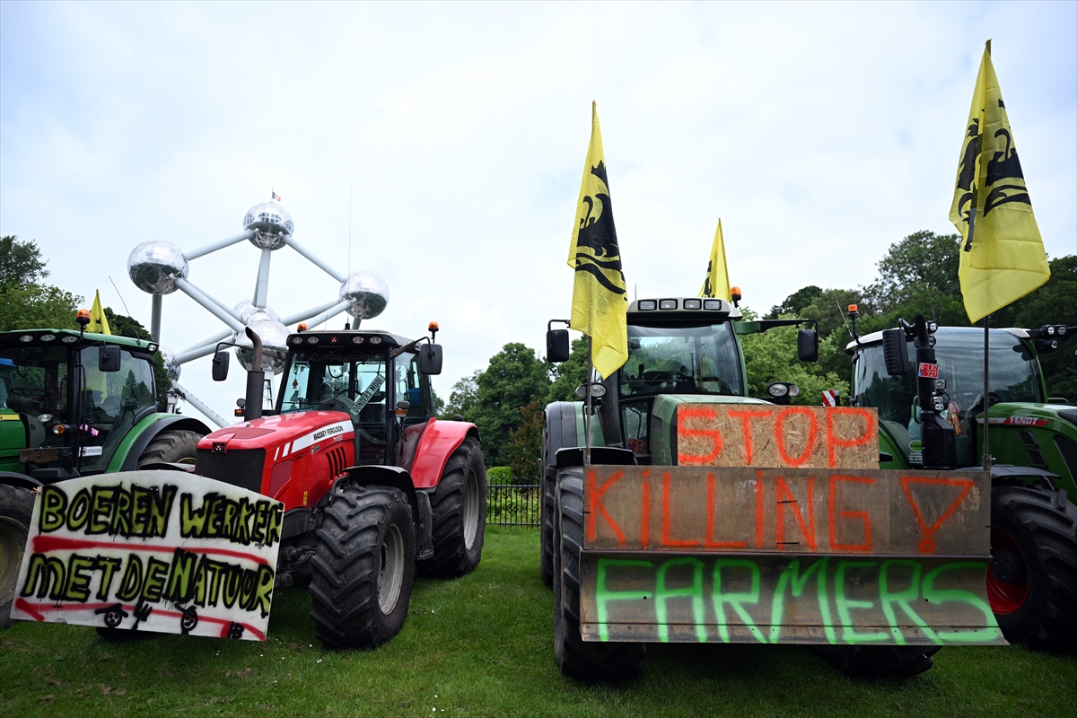 Yaklaşık 500 traktörü Atomium'un çevresine park eden çiftçiler, "Çiftçi yoksa gıda da yok", "Çiftçileri öldürmeyin", "Çevre kurallarını, vergisiz ithalatı ve göçü durdurun" yazan afişler astı.