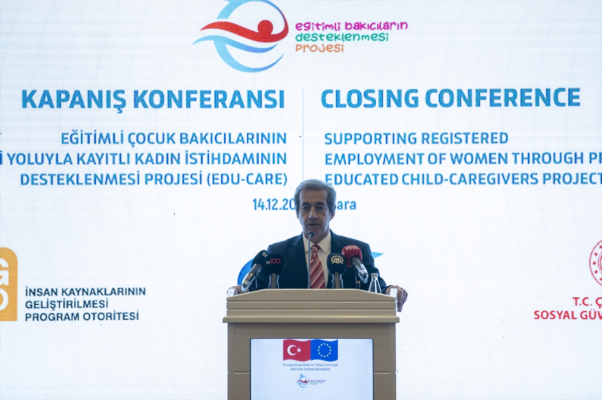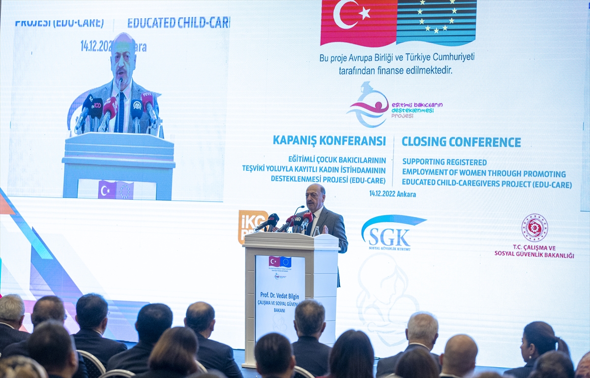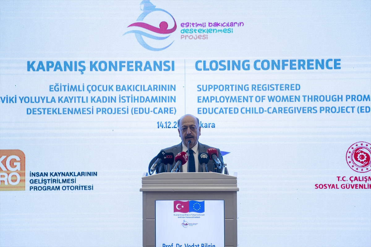 Bakan Bilgin, Sosyal Güvenlik Kurumunun (SGK), Türkiye Cumhuriyeti ve Avrupa Birliği'nin (AB) ortaklaşa finansmanı ile düzenlediği "Eğitimli Çocuk Bakıcılarının Teşviki Yoluyla Kayıtlı Kadın İstihdamının Desteklenmesi Projesi"nin (EDU-CARE) bir oteldeki kapanış konferansına katıldı.