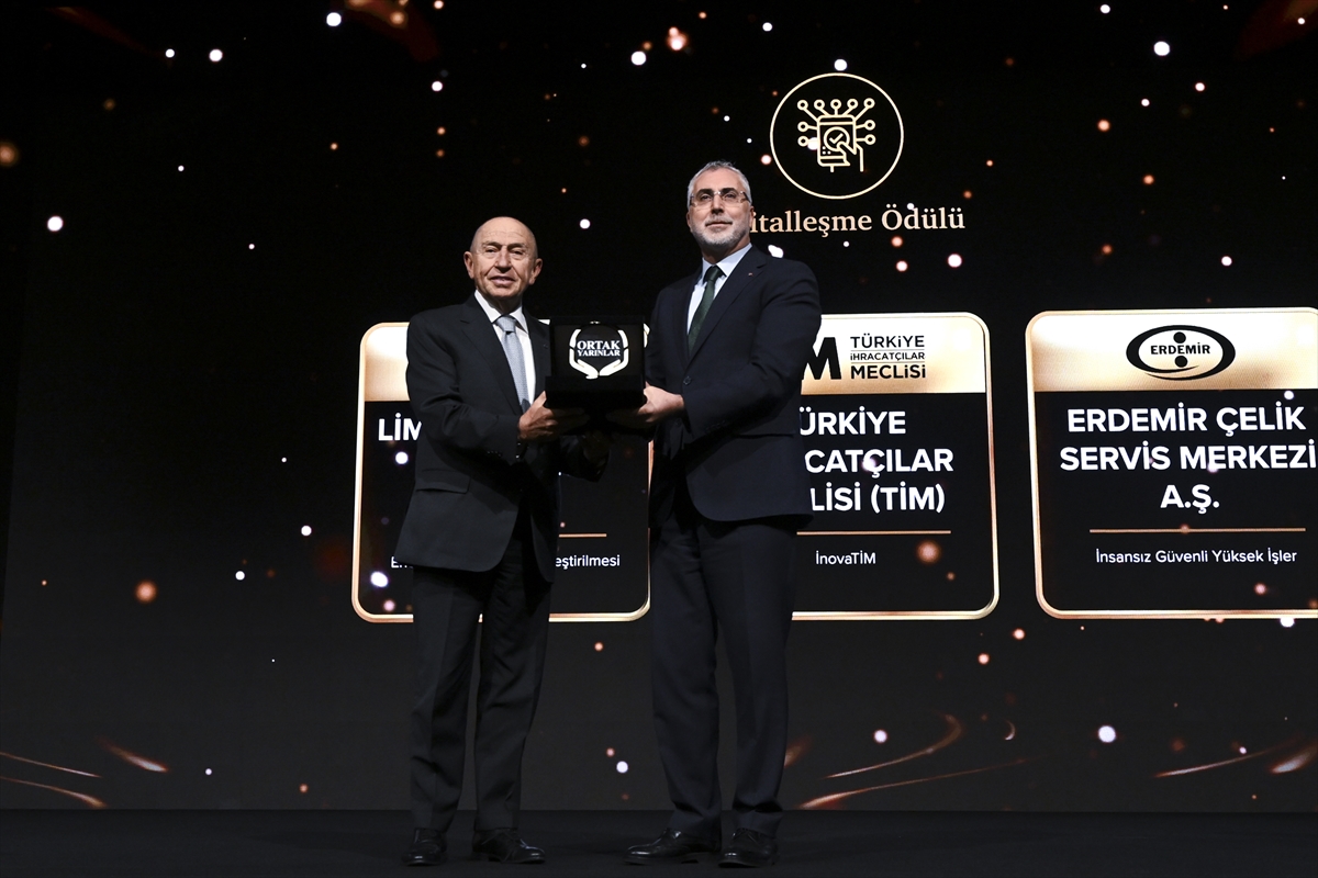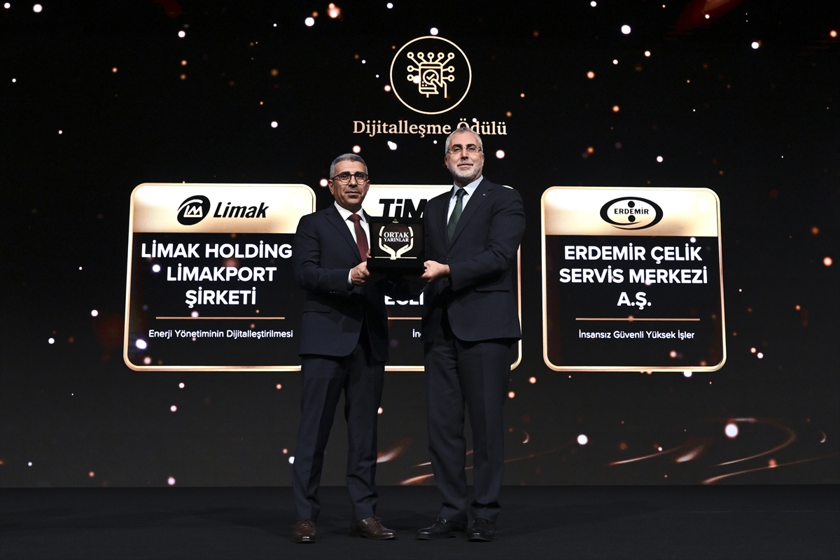 Bakan Işıkhan, "Dijitalleşme" kategorisinde ödül alan Limak Holding Yönetim Kurulu Başkanı Nihat Özdemir ve Erdemir Çelik Servis Merkezi Anonim Şirketi İbrahim Özbunar'a ödüllerini takdim etti.