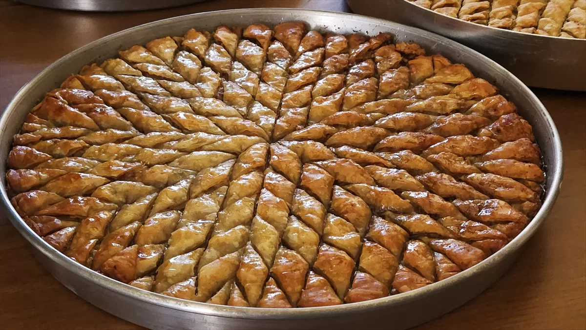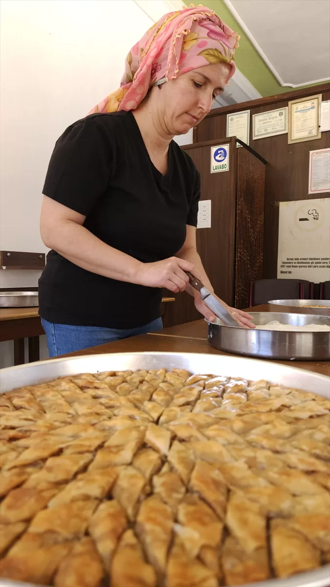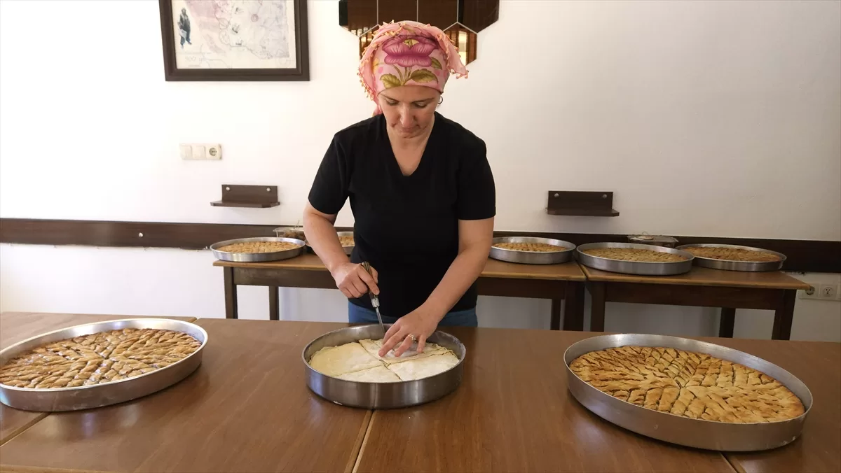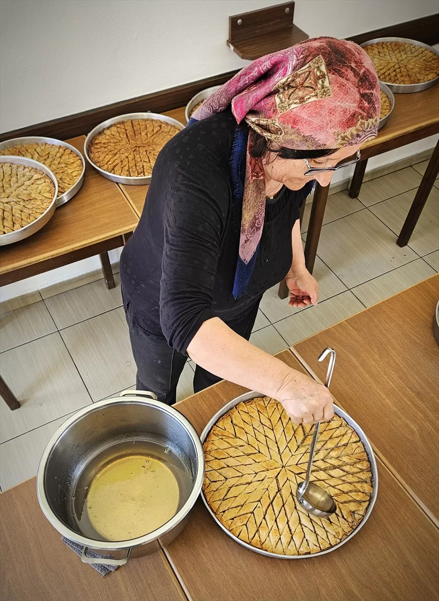 Bayram öncesi siparişleri yetiştirmek için iş bölümü yaparak 7 katlı baklavayı yöresel cevizle süsleyen üretici kadınlar, dilimlere ayırdıkları baklavayı odun ateşinde pişiriyor. Her bir tepsi yaklaşık 3 kilogram geliyor. Baklava, sıcak şerbeti de eklendikten sonra dinlenmeye bırakılıp müşterilere teslim ediliyor.
