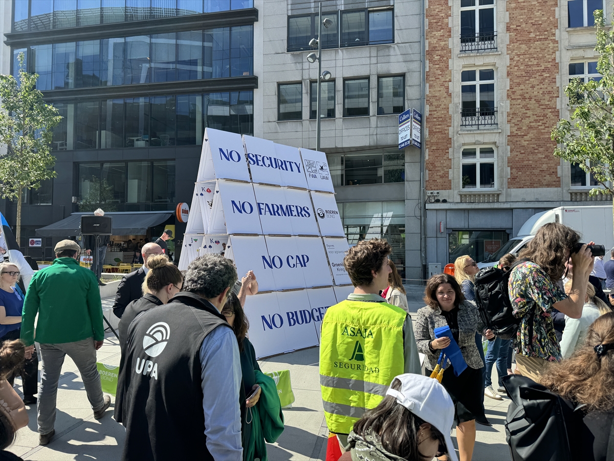 Büyük iskambil kartlarından "Bütçe Yok, Ortak Tarım Politikası Yok, Çiftçi Yok, Güvenlik Yok" yazılı bir kule yapan çiftçiler, eylem sonunda kuleyi devirdi.
